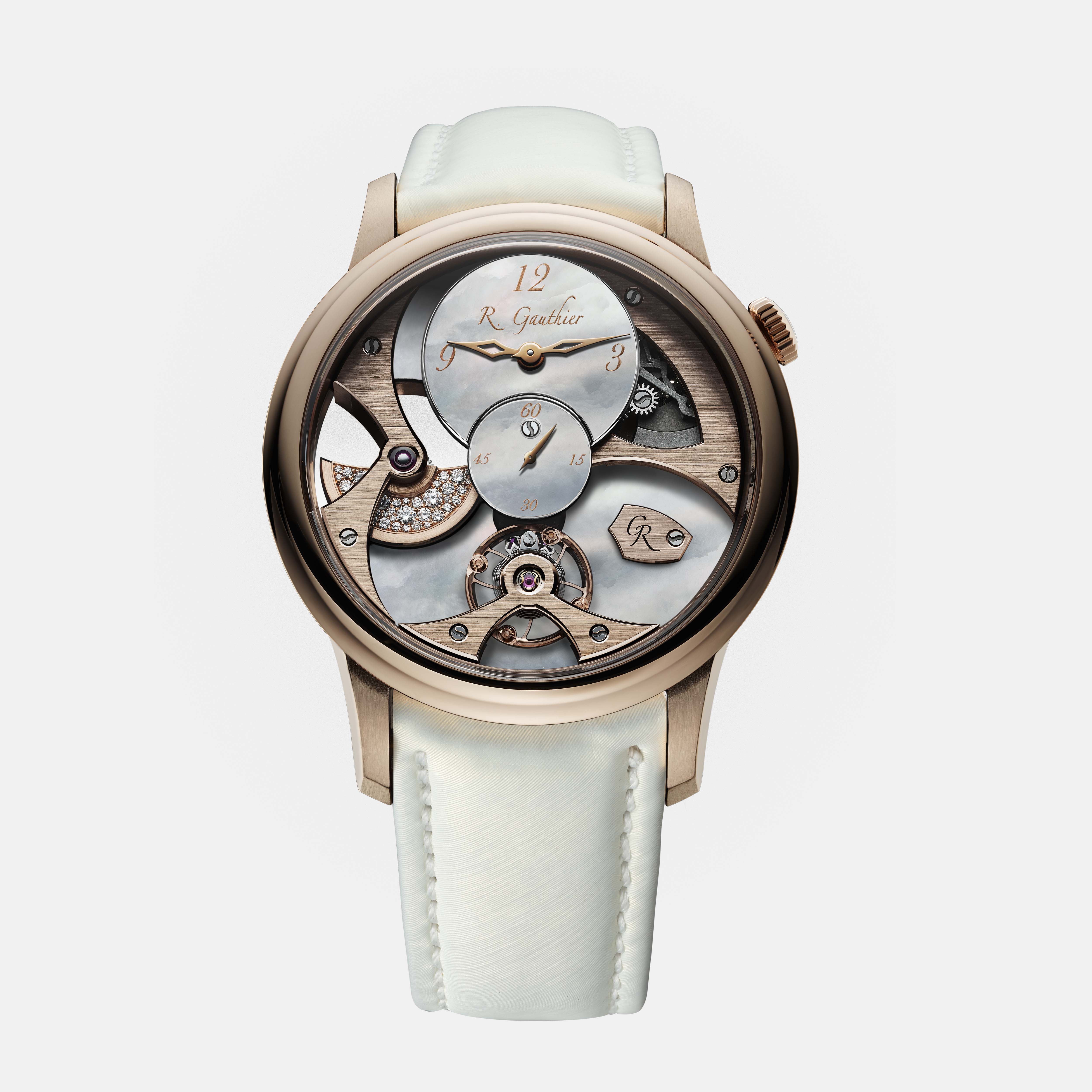 В секции Carré des Horlogers, где выставляются независимые часовщики, которых еще не успели прибрать к рукам люксовые концерны, женские новинки появляются очень редко, и тем ценнее каждая такая встреча. В этом году Romain Gauthier дебютировали не только на SIHH, но и в сегменте женских часов, предложив гендерную вариацию своего знаменитого механизма с микроротором. Благодаря открытой архитектуре автоматического калибра, созданного мастерами из Валь-де-Жу, можно бесконечно любоваться полетом усыпанного бриллиантами ротора, который кружит в вальсе рядом с перламутровыми циферблатами, сдерживаемый только парой изящных мостов из розового золота.