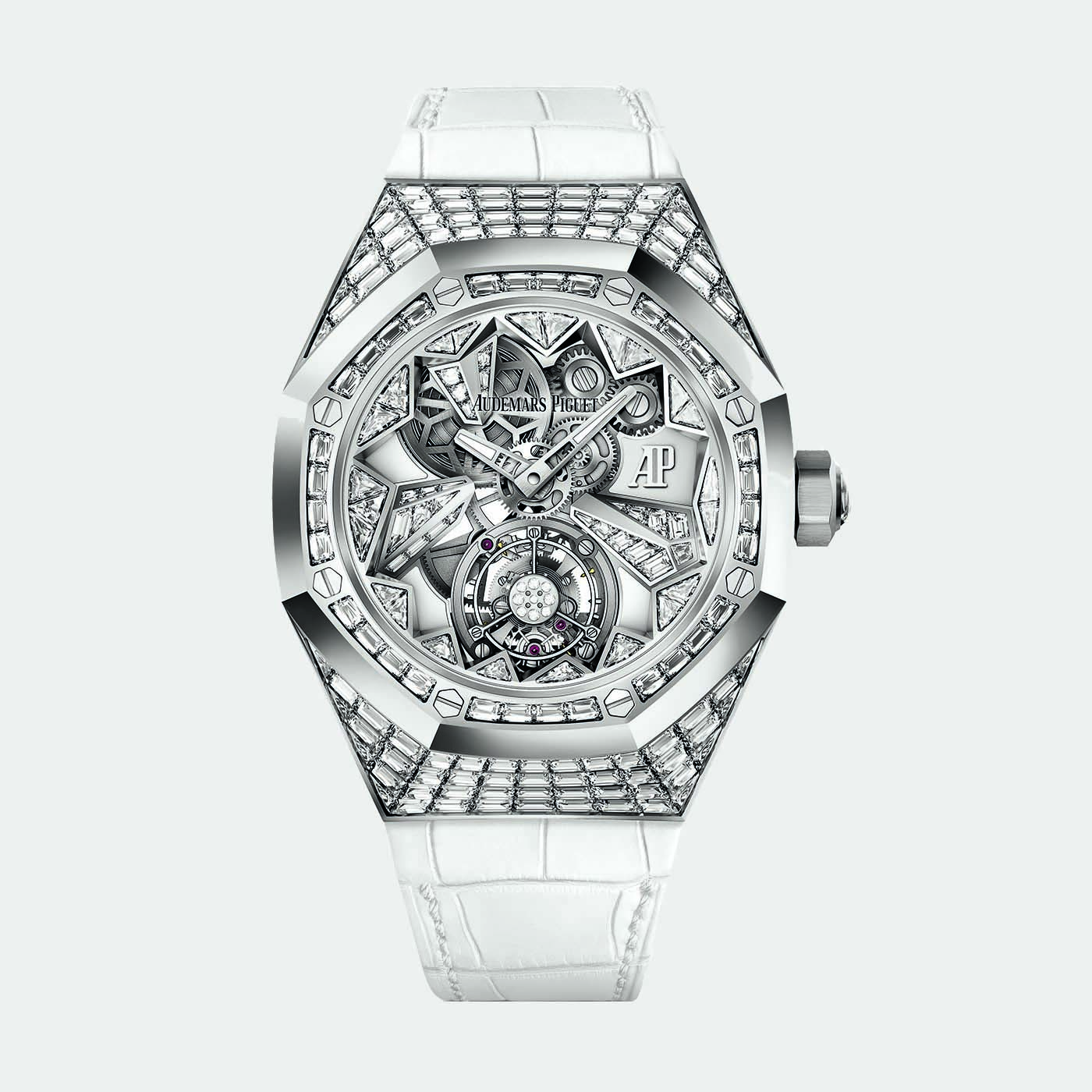 У почтенной марки Audemars Piguet есть несколько успешных женских линеек, которые регулярно обновляются, но в этот раз часовщики из Ле-Брассю приготовили своим поклонницам большой сюрприз. Royal Oak Concept Flying Tourbillon стал первой женской моделью в ряду концептов бренда и первым пристанищем парящего турбийона в истории Audemars Piguet: так выглядит победа феминизма в часовом мире. Деликатное усложнение помещено в удивительно компактный корпус из белого золота с многоуровневым ажурным циферблатом, дизайн которого вдохновлен снежинками и горными ледниками и обильно декорирован бриллиантами классической круглой формы или огранки «багет».