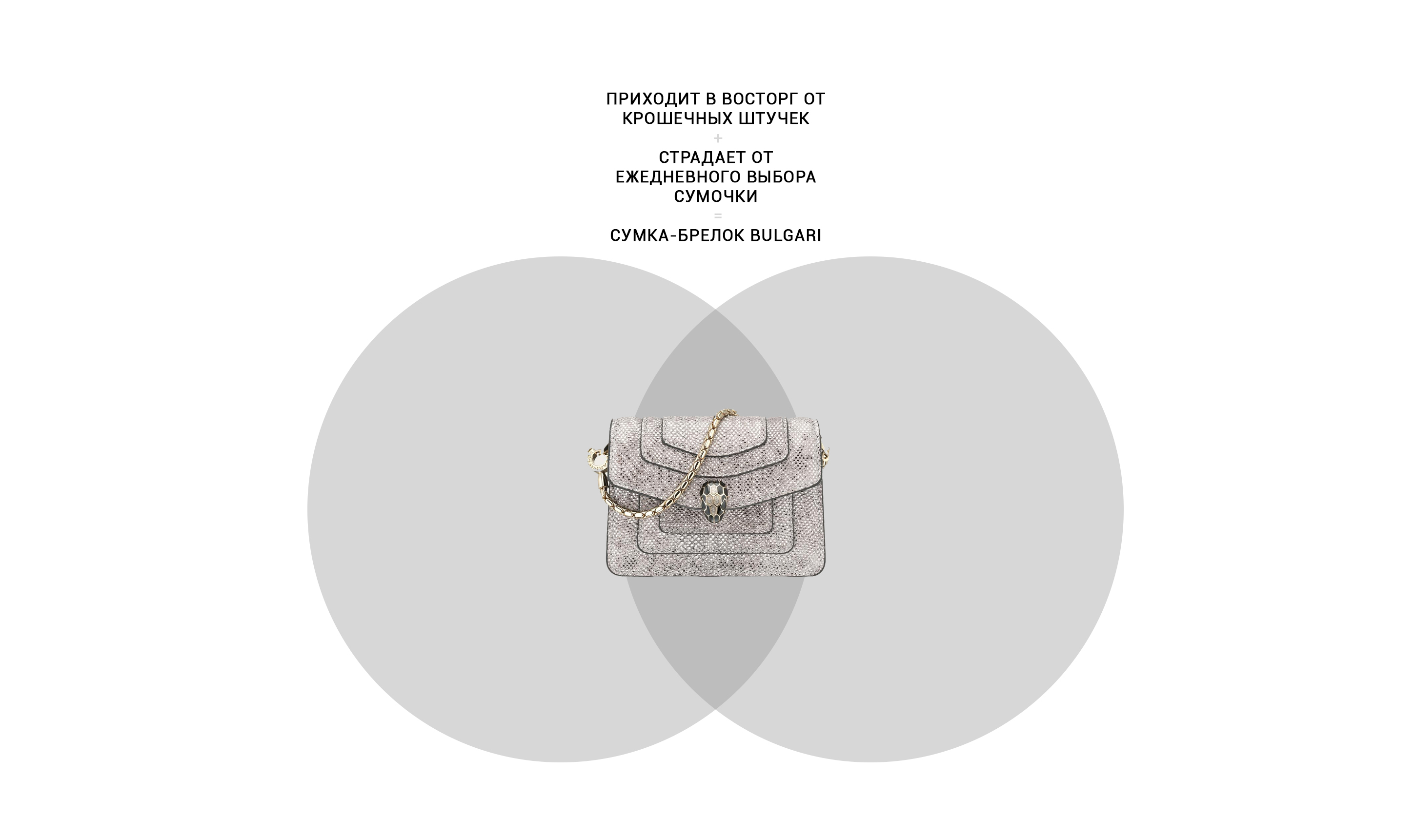 Иногда мы составляем таблицы «плюсов и минусов», чтобы принять взвешенное решение. В этот раз мы решили проэкспериментировать и применить похожий метод при выборе подарков ко Дню всех влюбленных. Принцип прост: выбираешь два каких-то качества своей половинки, соединяешь их и получаешь идеальный — ну или хотя бы смешной — подарок. Так мы скрестили нежную любовь к экологии и уходу за своим телом и получили набор натуральной косметики для волос Nashi Argan, а поклонницам Cartier и совершенно непунктуальным личностям, например, подойдут часы авторства ювелирного дома. Для любительниц сумочек, готовых носить их по две сразу, мы нашли идеальный вариант — сумка-брелок Bulgari, которую можно прицепить куда угодно.