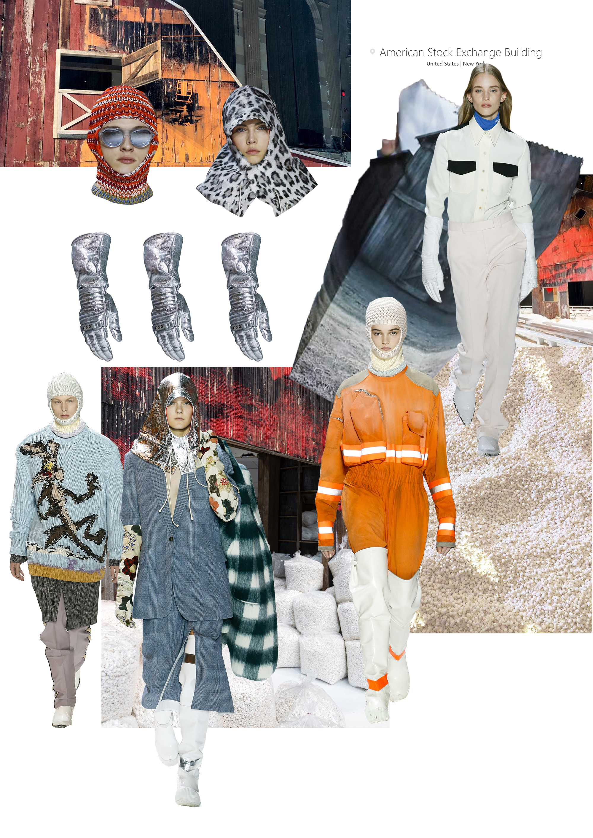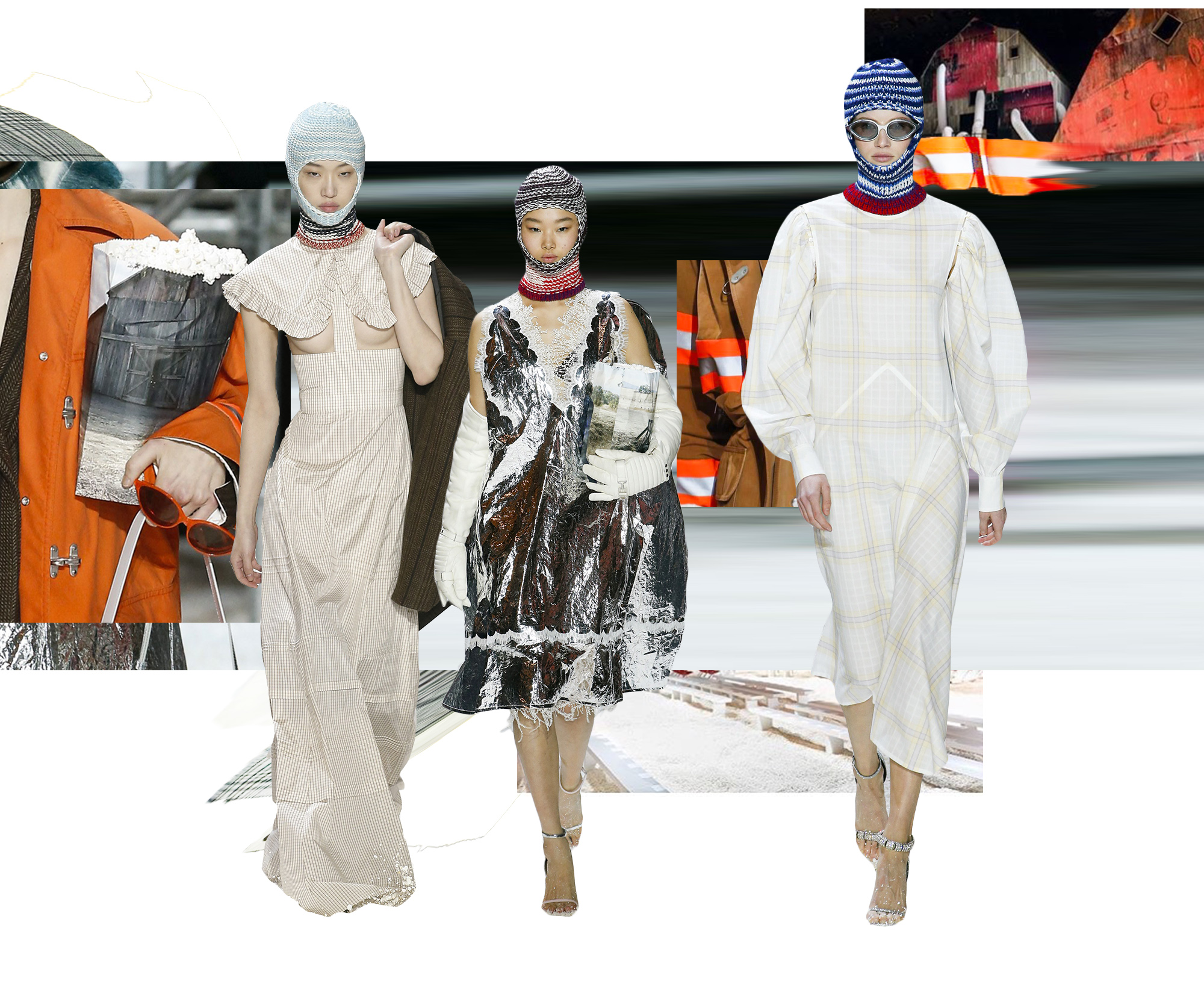 Отдельно в новой коллекции дизайнер выделяет вопрос безопасности. Показ открыла модель в костюме из ярко-оранжевых куртки и брюк со светоотражающими полосками, которые крайне похожи на те, что блестят на униформе пожарных, работников спецслужб и дорожных рабочих. Эти же полоски он поместил и на шубу из искусственного меха, и на маскулинные пальто, из-под которых выглядывали платья и длинные юбки с оборками, на клетчатые кюлоты и сапоги. Как и в прошлый раз, некоторые модели держали в руках пледы, но теперь они были с подложкой из фольги, как огнеупорные одеяла. Из нее же были сшиты платья, жилеты и сумки. Пока одни несли пледы, другие держали в руках бумажные пакеты с попкорном, которым был засыпан весь пол, — как еще один символ американской культуры и кинематографа. К слову, сет-дизайном занимались ребята из Bureau Betak.