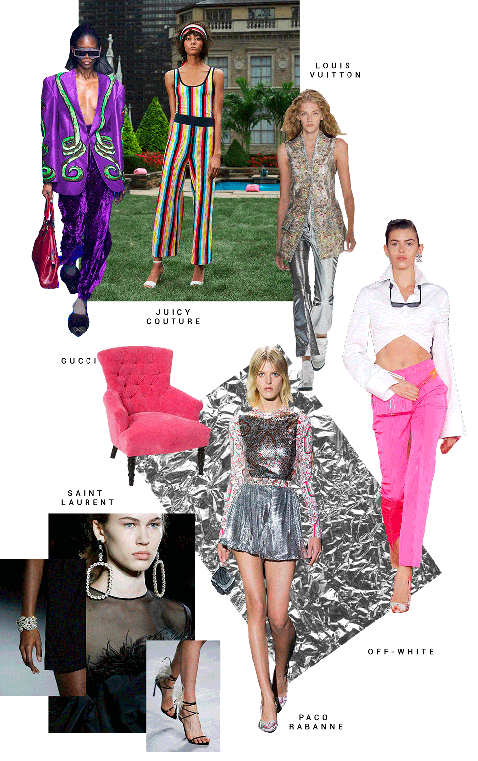 Gucci уже несколько сезонов подряд показывают, как сегодня выглядели бы представители той самой творческой богемы. У Alexandre Vauthier можно найти образ парижанки, которая уходит с любой вечеринки лишь под утро, а у Rodarte и Saint Laurent — поучиться носить страусиные перья, прозрачные фактуры и пайетки одновременно (и не выглядеть при этом вульгарно). В рядах поклонников пайеток еще и Anna Sui, Christian Dior и Giorgio Armani, и им неважно, это будет брючный костюм или платье. Главное — побольше блеска. В Paco Rabanne и Louis Vuitton уверены, что если танцевать, то только в «металлическом» образе, а любителям кислотных оттенков и «диких» принтов — обращаться к Off-White, Juicy Couture, R13 и Zadig & Voltaire.