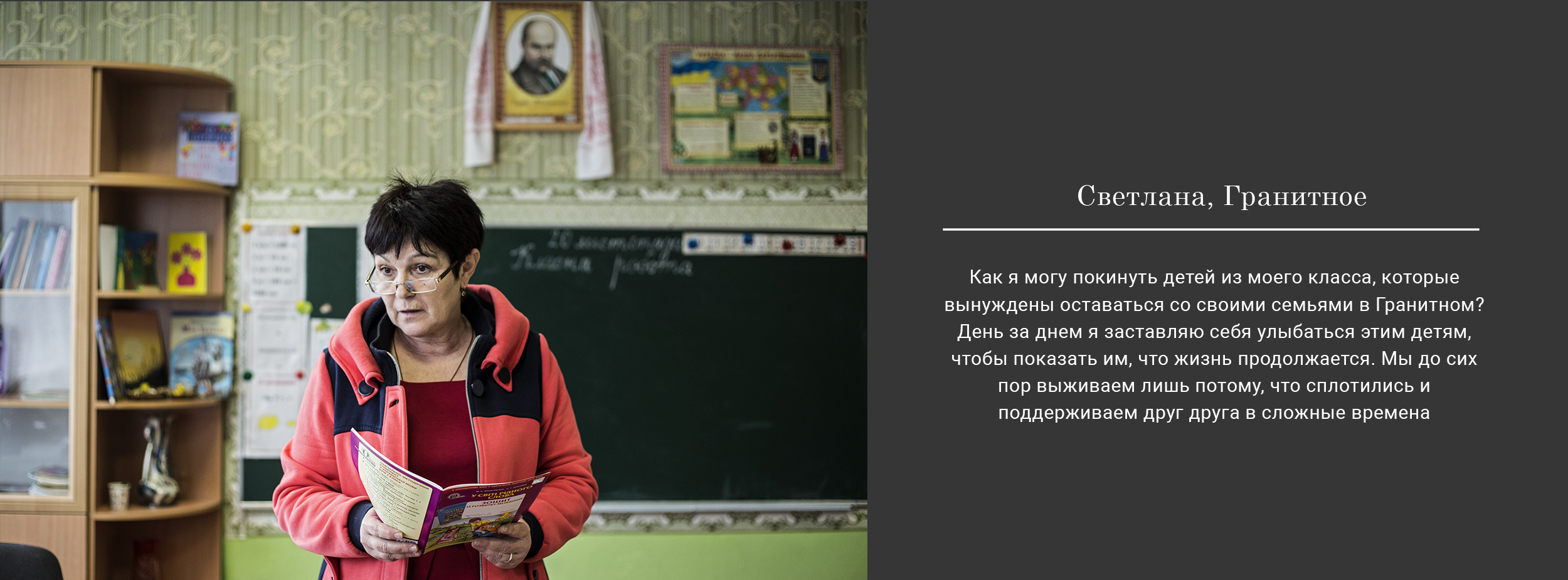 Светлана – учительница начальных классов в селе Гранитное. Она не хочет уезжать и продолжает обучать детей, несмотря на близость школы к линии соприкосновения.