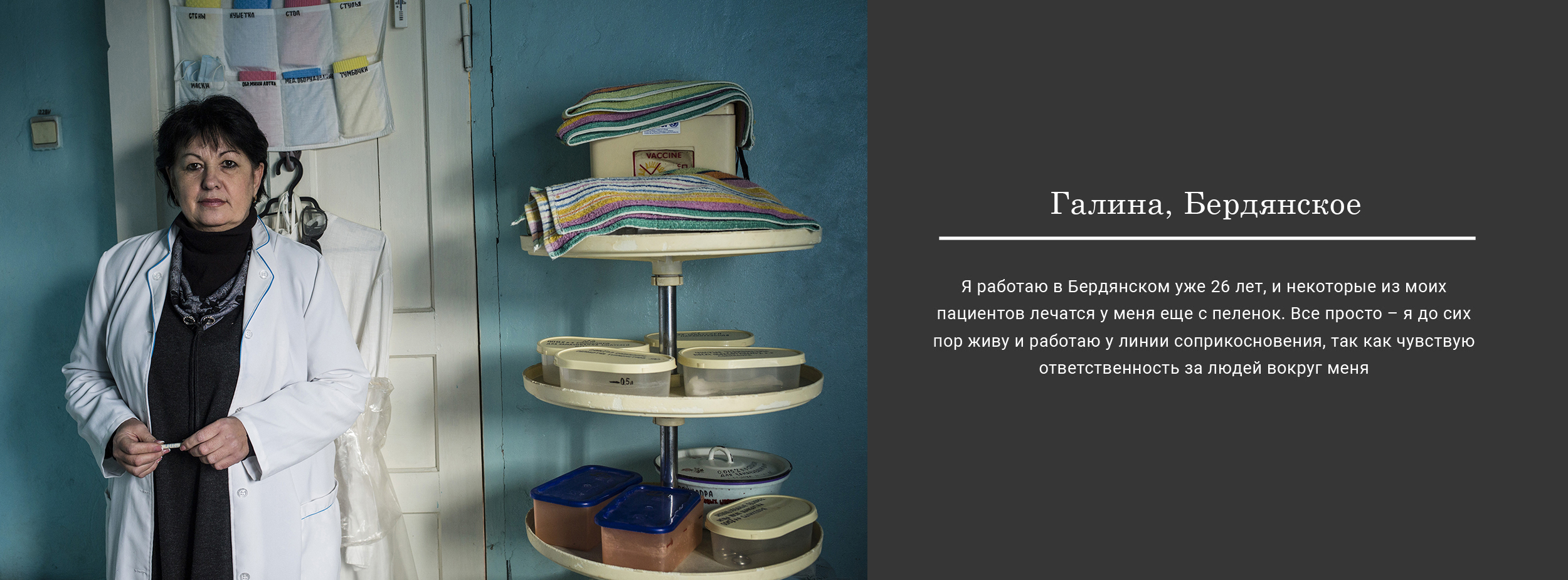 Галина заведует медицинским пунктом в Бердянском и в настоящее время является единственным медиком, оставшимся в этом приазовском селе. Если бы не она, для получения даже первой медицинской помощи местным жителям пришлось бы пересекать военные пункты пропуска и ехать в другое село.