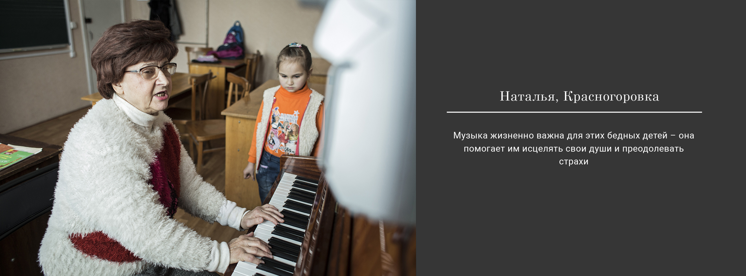 Наталья – учительница в Красногоровской музыкальной школе. Она уже 28 лет обучает местных детей музыке. Несмотря на ежедневные трудности, вызванные конфликтом, ученики Натальи продолжают побеждать в региональных и национальных музыкальных конкурсах. Наталья объясняет, что никакие обстоятельства никогда не заставят ее прекратить делать то, что она любит.
