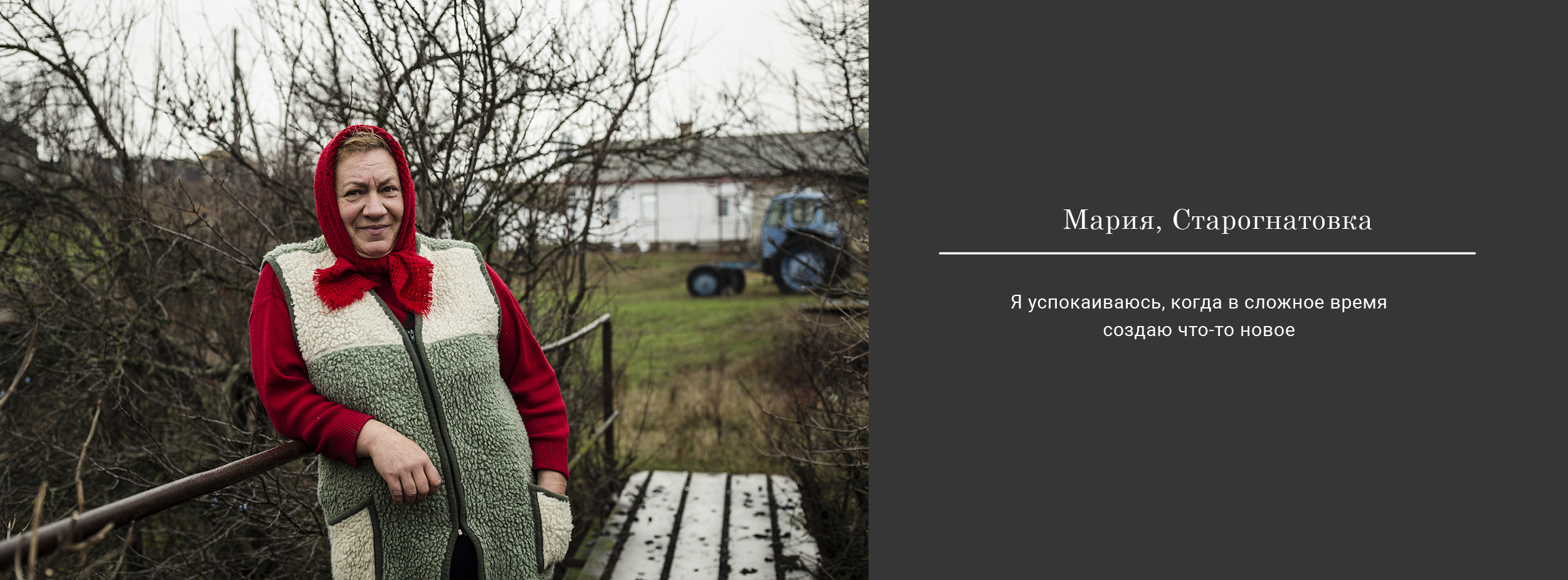 Мария – жительница Старогнатовки. В августе 2015 года ее муж погиб во время обстрела. Несмотря на эту потерю и серьезные проблемы со здоровьем, Мария продолжает самостоятельно вести большое хозяйство. Она регулярно высылает домашние продукты семьям своих детей в Мариуполе и выращивает фруктовые деревья в собственном саду, чтобы делиться урожаем с другими.