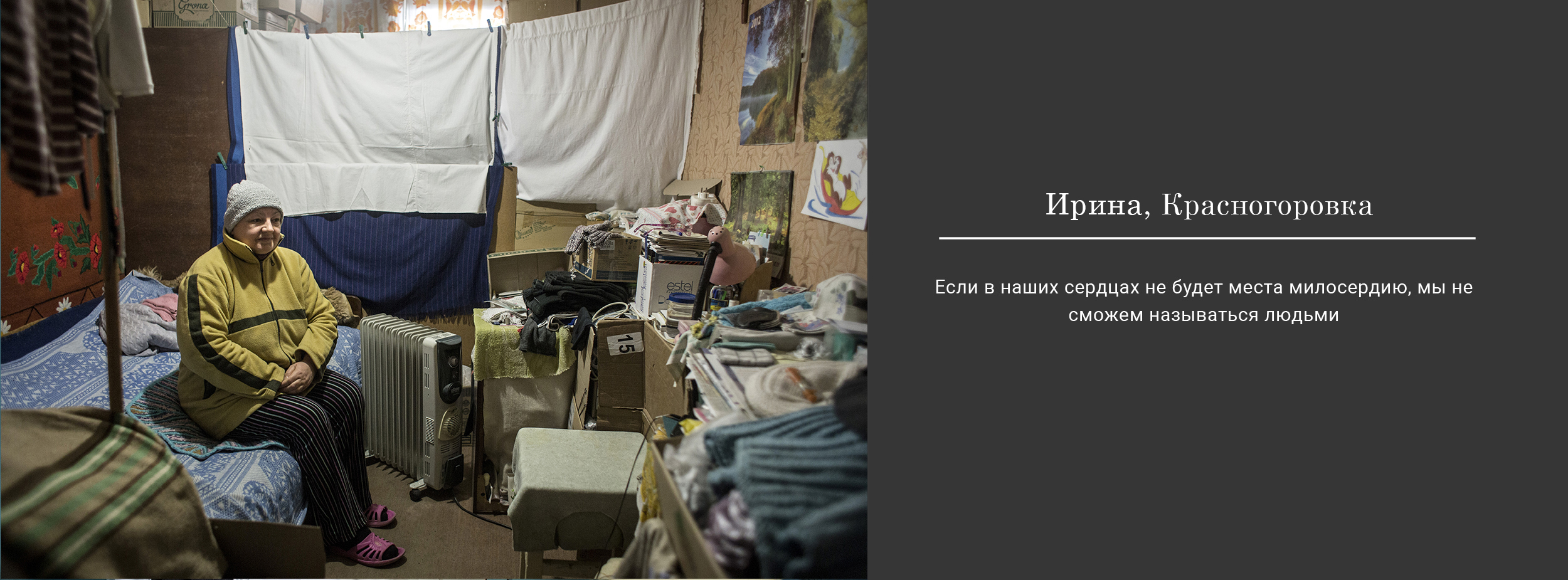 В течение последних четырех лет она живет в своей квартире в сильно поврежденном пятиэтажном доме. Квартира этажом выше была полностью разрушена во время обстрела, и практически все соседи уехали. Несмотря на разбитые окна, перебои в водо- и электроснабжении и невысокую пенсию, Ирина продолжает кормить окружающих бездомных кошек и собак.