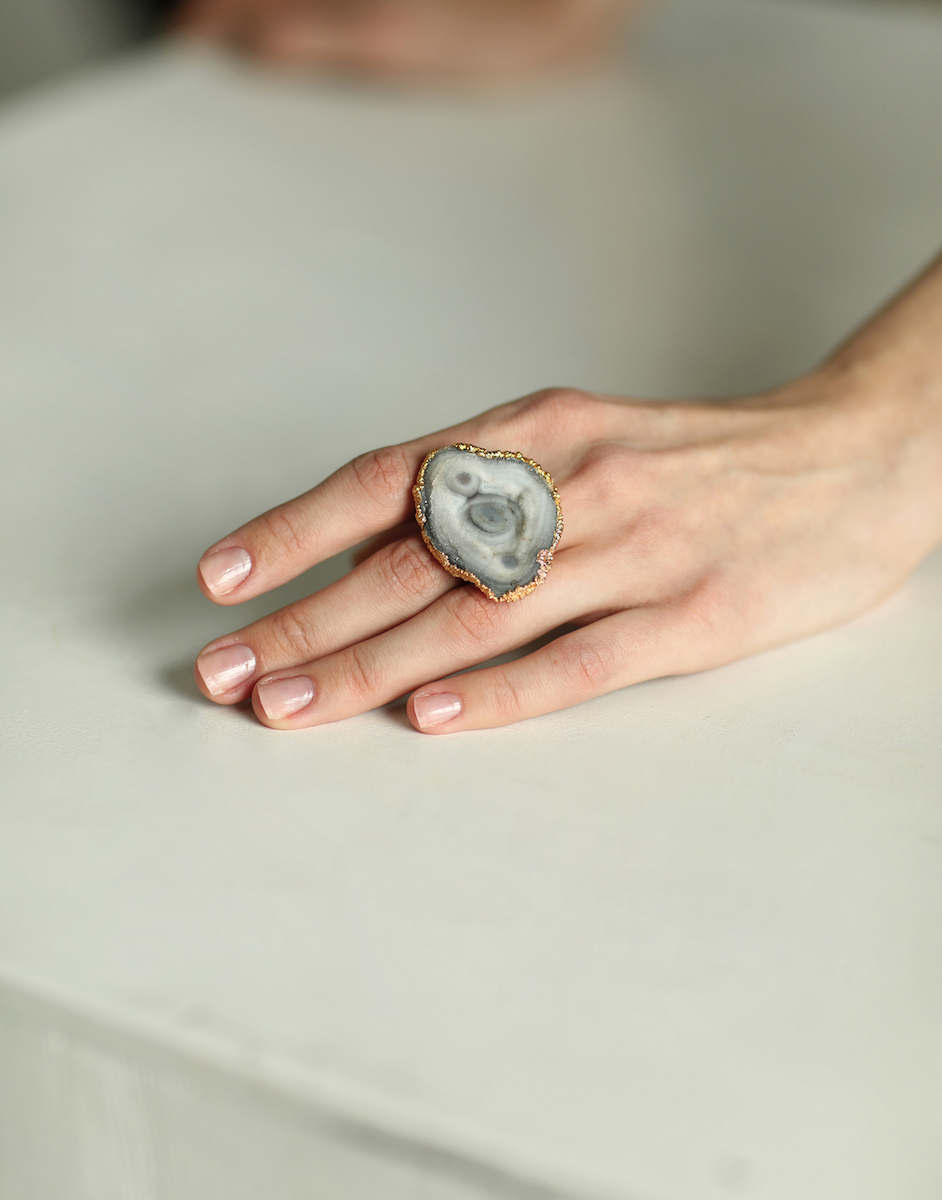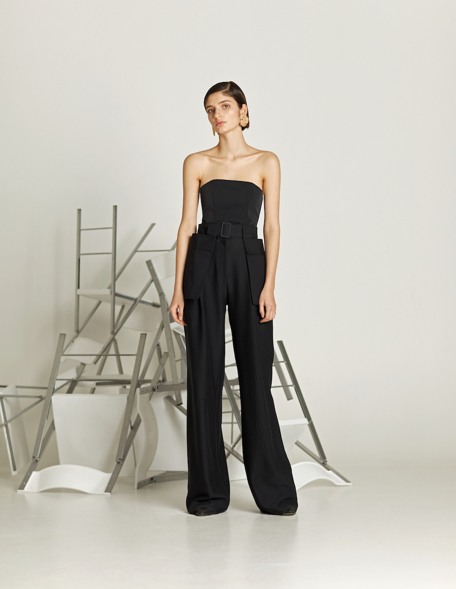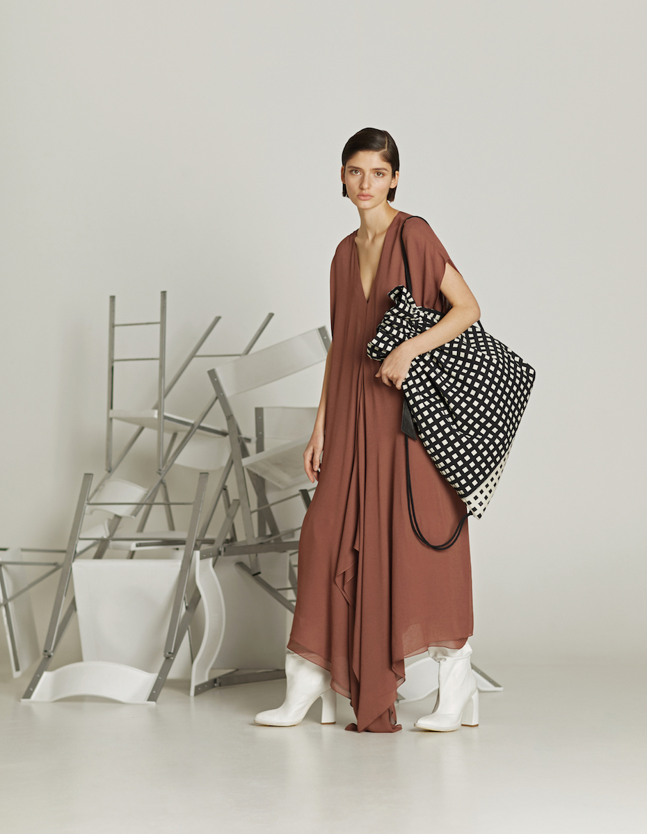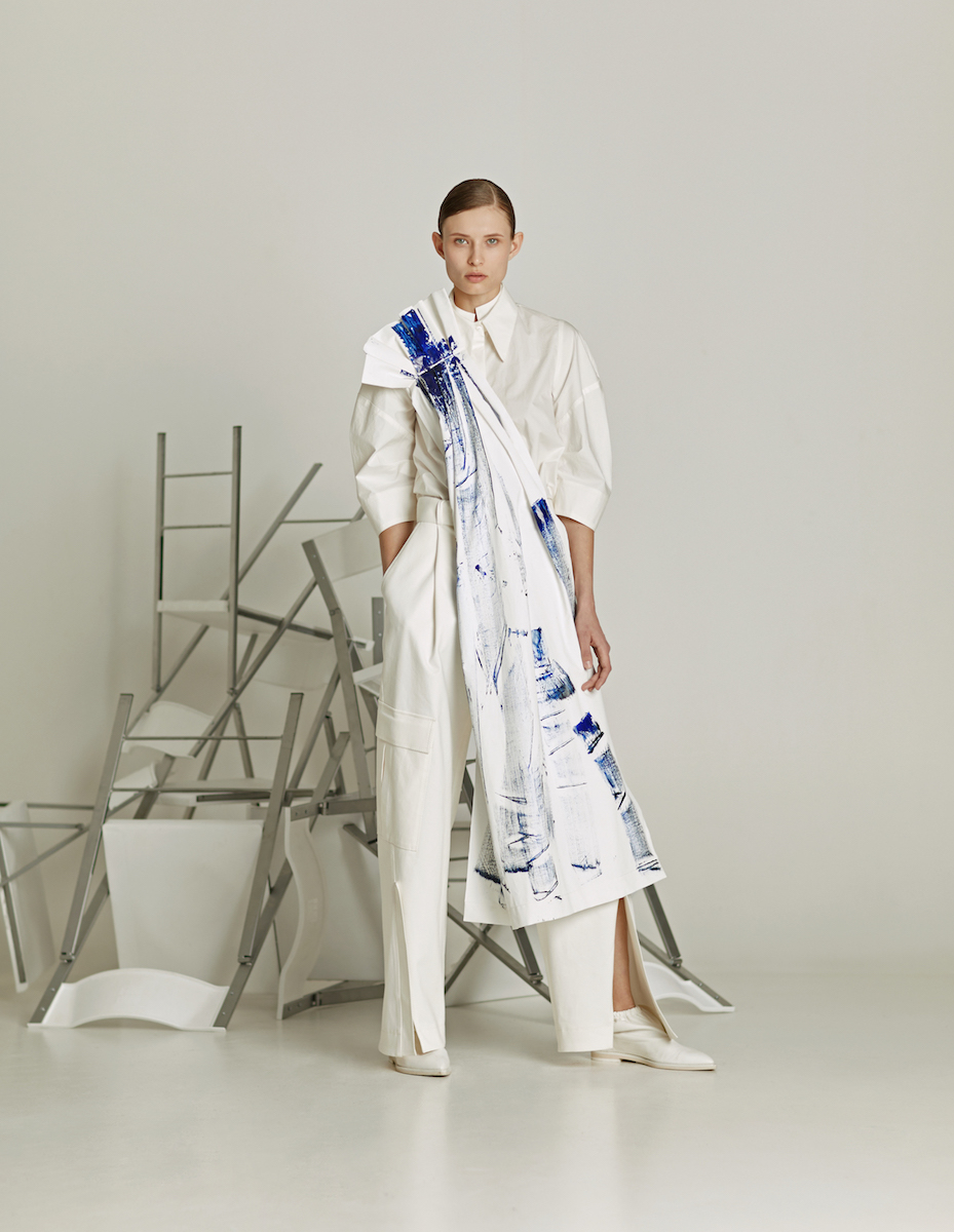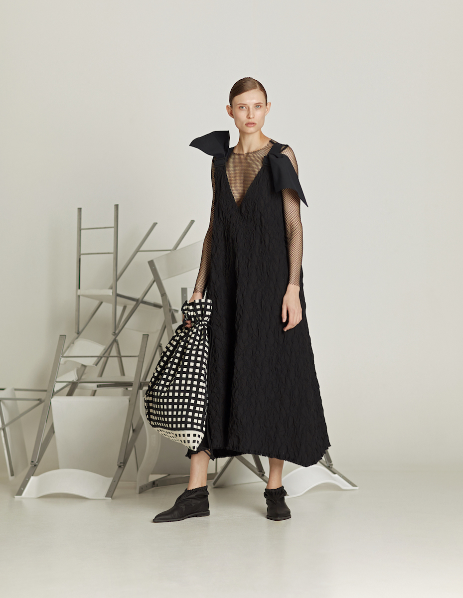 Графичные платья-рубашки, строгие, но при этом очень женственные силуэты костюмов, маскулинные жакеты и жилеты в сочетании с высокими ботфортами и перчатками. Цитата из строительных ретрокомбинезонов – огромные карманы – присутствует практически во всех элементах коллекции: макинтошах, пальто, брюках, платьях и даже на гигантских сумках-мешках. В коллекции также много клетки как аллюзии на металлические сетки и арматуру. В крое обуви считываются защитные бахилы, а украшения из золота и серебра работы Сергея Жернова выполнены в форме строительных балок с выглядывающими из-под побелки драгоценными камнями.