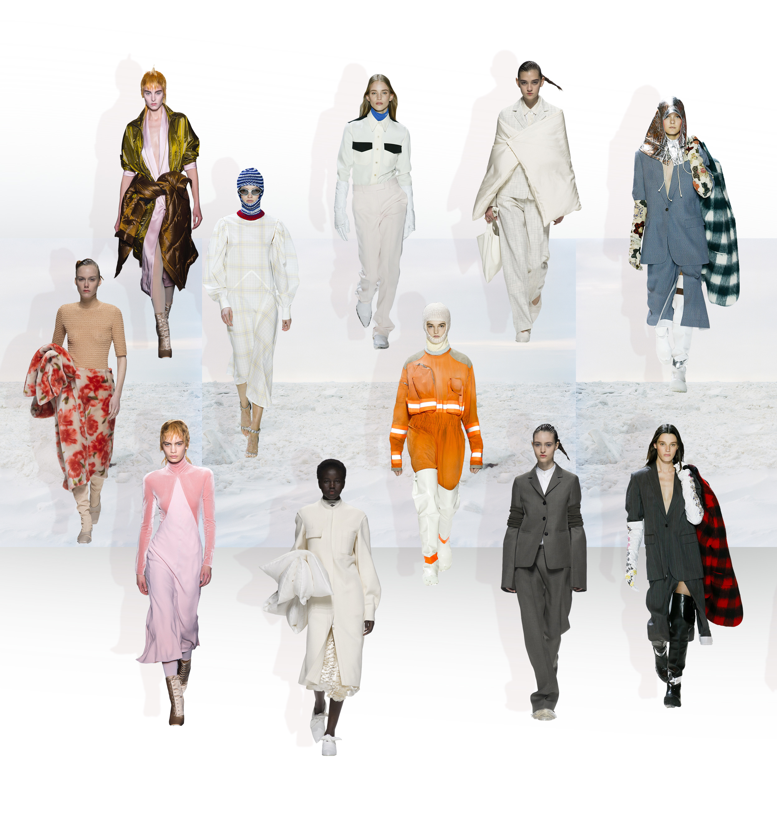 Calvin Klein под предводительством Рафа Симонса в новом сезоне размышляют о безопасности и защите: высказывая тревожные мысли по поводу времени, в котором мы живем, в будущее дизайнер все же смотрит с надеждой, веря в то, что тяжелые времена вскоре закончатся. Как показать это с помощью одежды? Симонс надевает на моделей куртки и брюки со светоотражающими полосками, напоминающие униформы рабочих и пожарных, дает им в руки пледы, похожие на огнеупорные одеяла, и дополняет эти защитные элементы трепетными и ранимыми кружевами и оборками.
