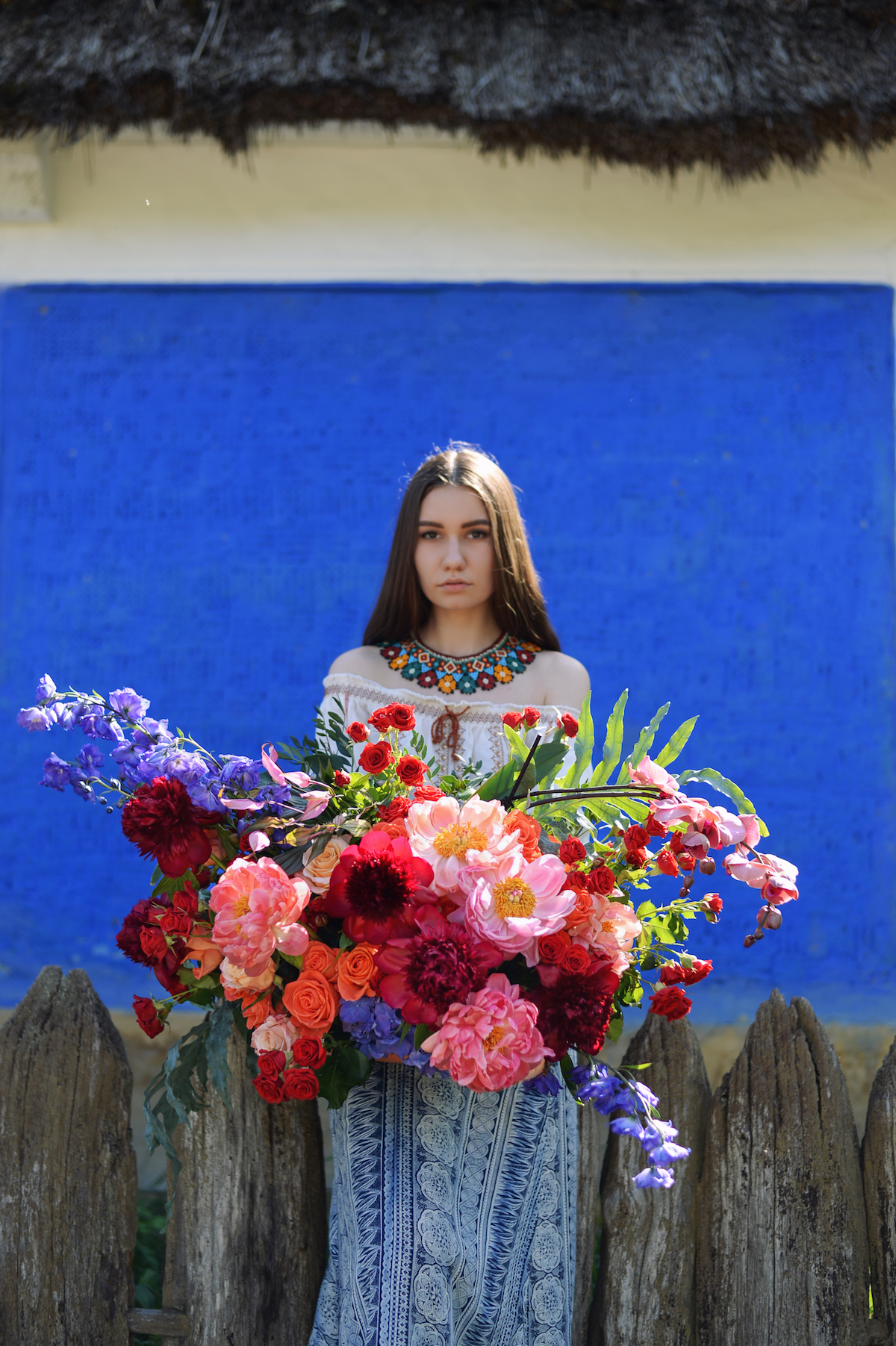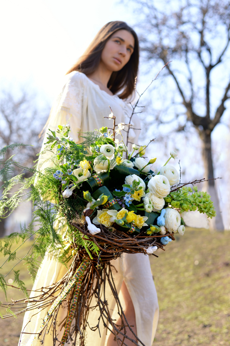 Жива – западнославянская богиня жизни, плодородия и весны. Создавая букет, посвященный этой богине, флористы LoraShen использовали в качестве основы белый ранункулюс и голубой морозник, а завершить композицию помогли крупные листья и ветки.