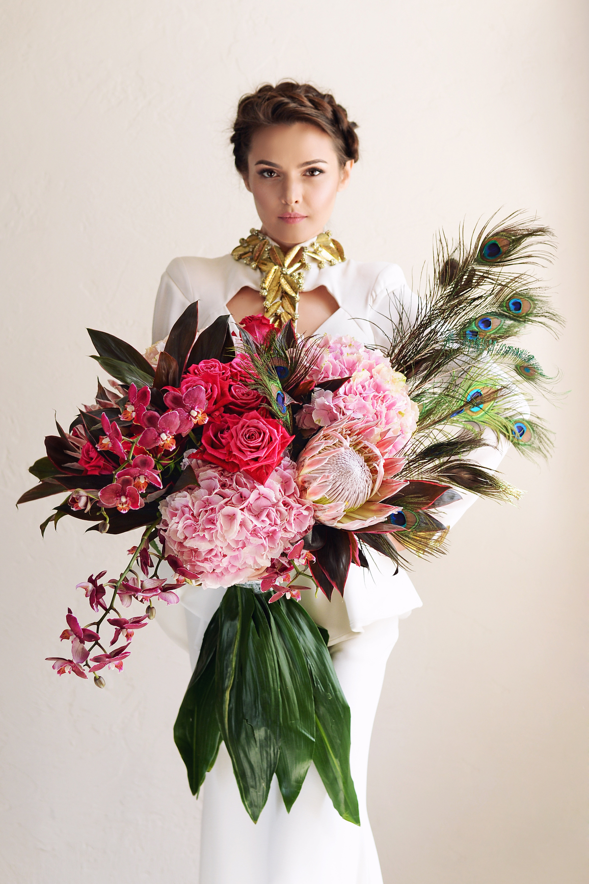 Гера – в древнегреческой мифологии покровительница брака, охраняющая мать во время родов. Она являлась одной из верховных богинь и приходилась сестрой и женой Зевсу. Для создания серии букетов, посвященных Гере, флористы LoraShen выбрали цвет марсала и оттенки пастельного розового. Селекционные цветы, перья павлинов и золотые экзотические листья стали аллюзиями серебряной колесницы с золотыми колесами, которую вез павлин, – именно так следовало изображать Геру.