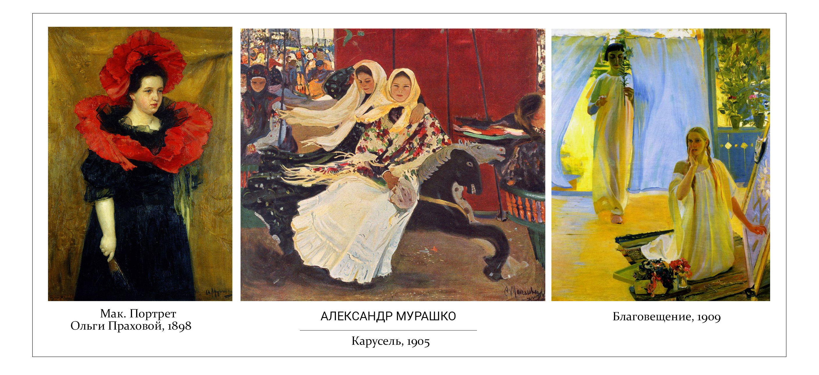 В изобразительном искусстве одним из самых интересных художников того периода был Александр Мурашко – автор, который сформировался между Киевом, Петербургом, Парижем и Мюнхеном, который привез в Украину энергетику постимпрессионизма и модерна. Мировое признание автор получил с картиной «Карусель»: ей досталась золотая медаль на Мюнхенской международной выставке. После этого художник получил множество приглашений из европейских городов: Берлина, Вены, Парижа, Амстердама, Мюнхена, Венеции. Но в 1919 году Александр Мурашко трагически погиб при непонятных обстоятельствах: его нашли недалеко от собственного дома на Лукьяновке застреленным в затылок. Наиболее вероятна версия убийства советской милицией, но в тогдашней прессе написали «был ограблен и убит бандитами».