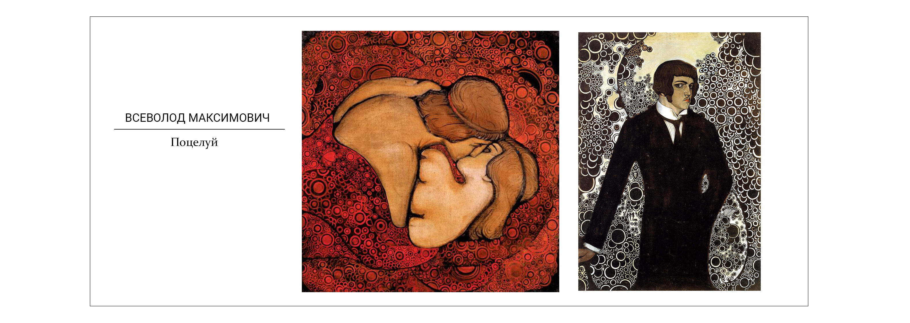 Конец века – это всегда время тревоги. В конце XIX и в начале XX века экзистенциальные художественные тревоги вылились в декаданс. В Украине его олицетворяет Всеволод Максимович, работы которого созданы в определенном диалоге с произведениями Врубеля. А вот его картина «Поцелуй» отсылает к одноименной работе Климта. Полотна Максимовича стали одними из самых ярких в стиле сецессии, но путь к признанию при жизни оборвал сам автор. В 20 лет Всеволод Максимович покончил жизнь самоубийством, то ли после длительной депрессии, то ли от несчастной любви, то ли после алкогольных и наркотических экспериментов. За свою короткую жизнь он успел сняться в футуристическом фильме «Драма в кабаре футуристов» и оставить много работ, часть из которых находится в коллекции НХМУ.