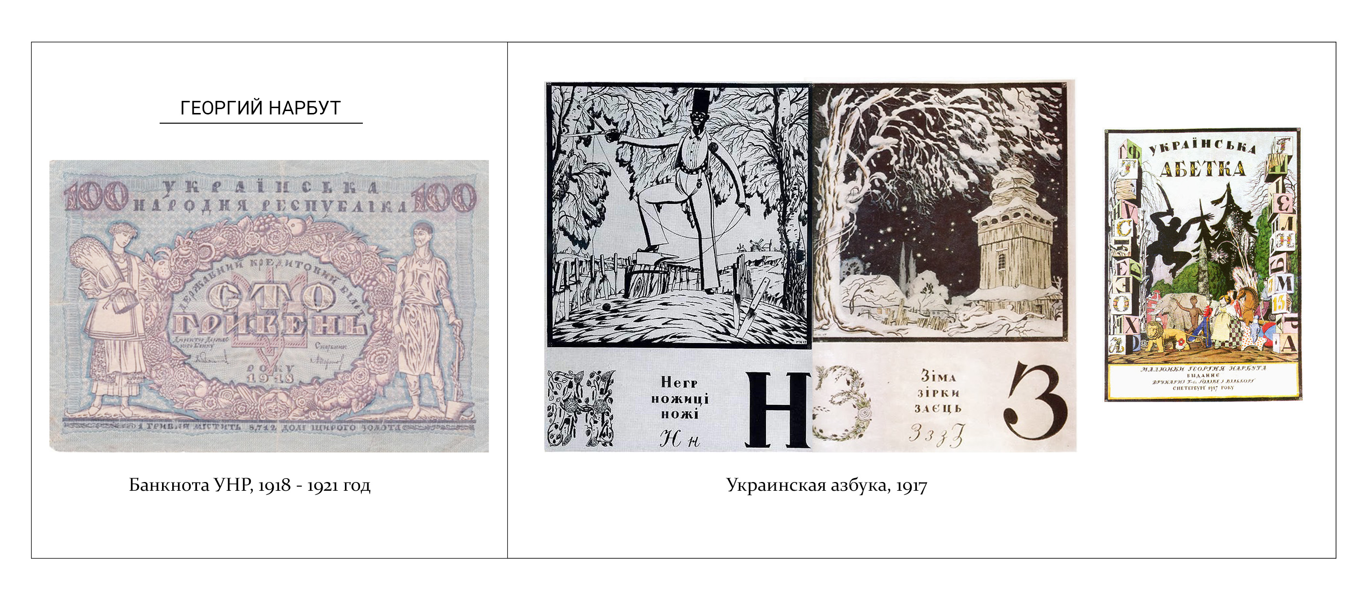 Георгий Нарбут – автор культовых еще и в социальном плане вещей. Именно он создал украинскую азбуку 1917 года, банкноту УНР номиналом в 100 гривен, которая была в употреблении с 1918 по 1921 год. Нарбут также создал дизайн печати Украинской академии искусств, которая была создана в 1917 году. Академия становится эпицентром художественной жизни: сюда приезжают преподавать легенды авангарда, вроде Татлина и Малевича. Тут идет постоянный поиск и стремительное развитие украинского искусства, которое прерывается трагическими событиями 1930-х годов.
