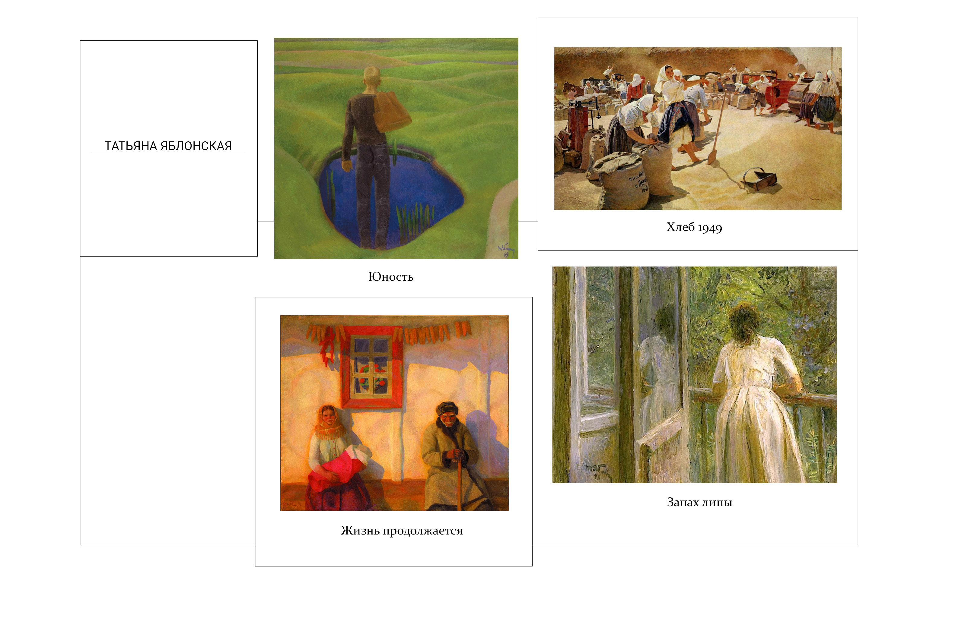 Для Яблонской репрессии 37-го года и авангард были совершенно другим поколением. У нее не было травмы переживания краха предыдущего утопического проекта и репрессий. Ее воспитание – это патриотизм военных лет. Культовая работа художницы «Хлеб» написана в 1949 году – и именно за нее Яблонская получила Сталинскую премию. Репродукция «Хлеба» украшала чуть ли не каждое советское жилище на календарях и плакатах. Эта картина идеально передает основную тему искусства 40-х годов: показать тяжелый труд и радость от окончания войны.