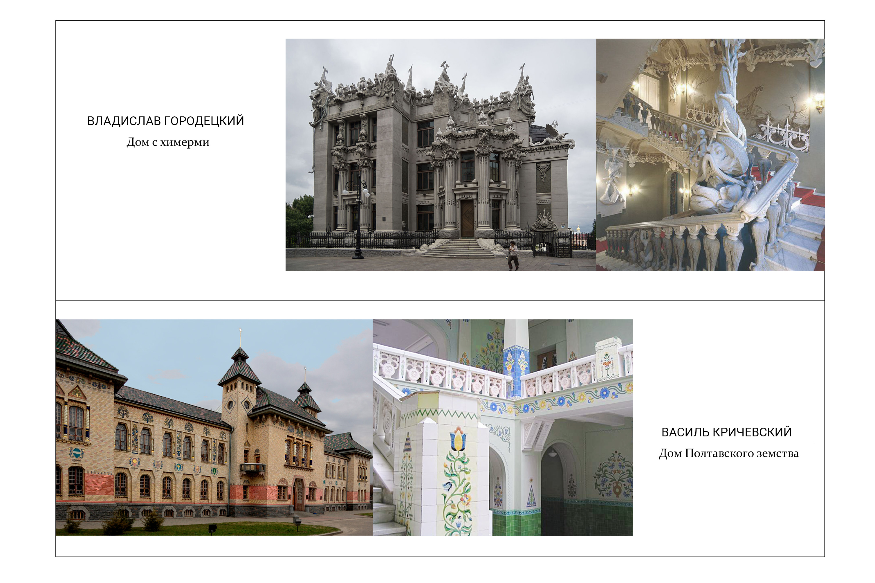 В это же время существовала совершенно противоположная социально-критическая линия в виде искусства модерна, которое возникло в Европе на стыке 1880-х и 1890-х и распространилось под локальными разновидностями. В одних странах это было ар-нуво, в других – сецессия. Большое влияние на украинское искусство оказала именно сецессия в ее венском варианте, поскольку часть Украины находилась в составе Австро-Венгерской империи. В этом направлении мало острых углов, прямых линий, очень много морфологии, которая напоминает растительный мир. В мировом искусстве наиболее известные представители – Антонио Гауди и его сюрреалистические архитектурные линии, живопись Густава Климта. В украинском искусстве модерн ярко воплотился в архитектуре: все знают Дом с химерами Владислава Городецкого. Менее известен проект Василия Кричевского – один из первых архитектурных ансамблей в стиле модерн, Дом Полтавского земства.