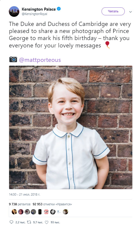 Кенсингтонский дворец выложил на своей официальной странице в твиттере новое фото принца Джорджа Александра Луи в честь его пятого дня рождения. Известно, что снимок был сделан 9 июля, в день крестин третьего ребенка герцогов Кембриджских, младшего брата Джорджа — принца Луи, но в интернете он появился только сейчас.