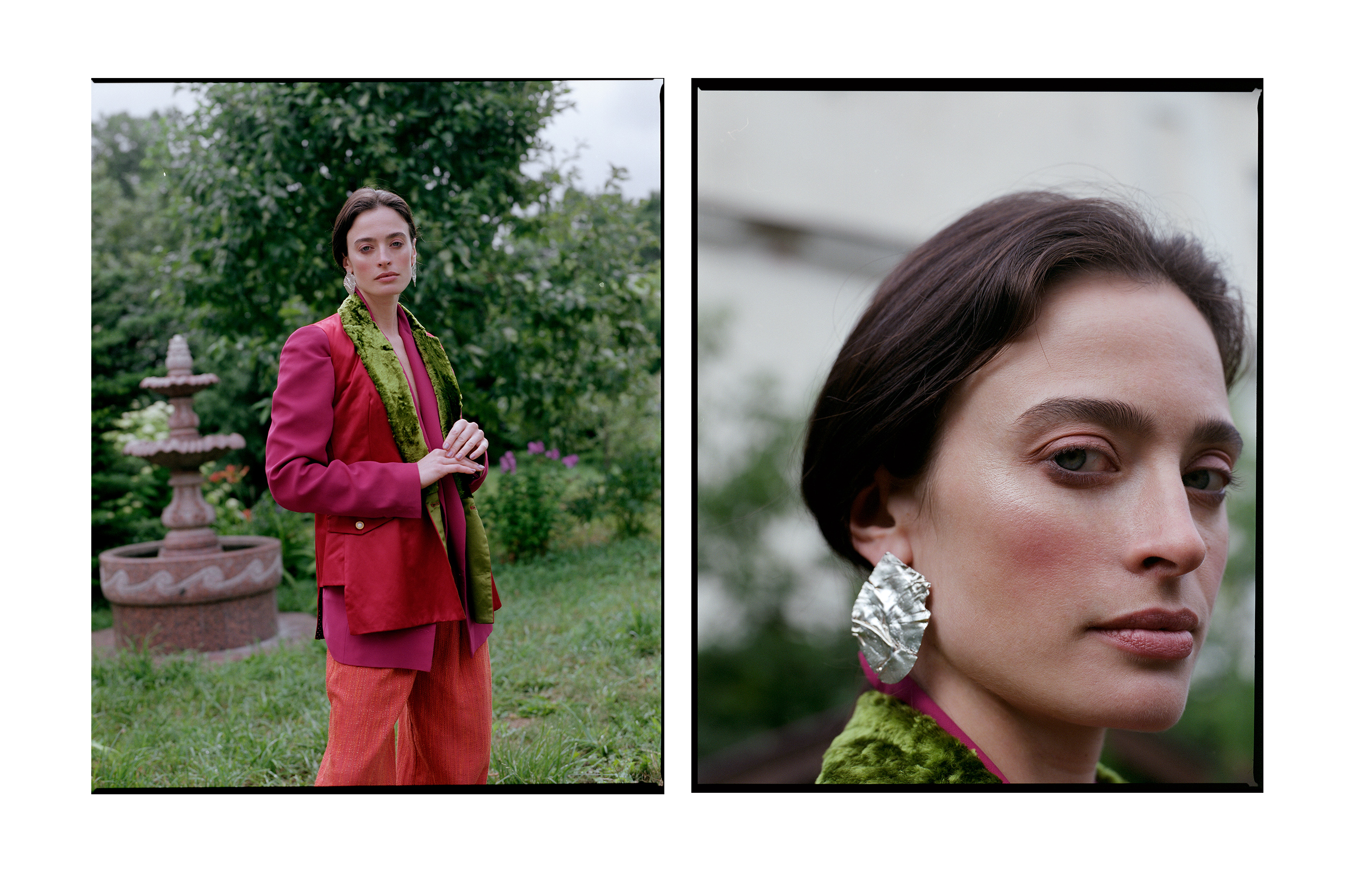 Справа: жакет и брюки Dokuchaeva, серьги Ringstone