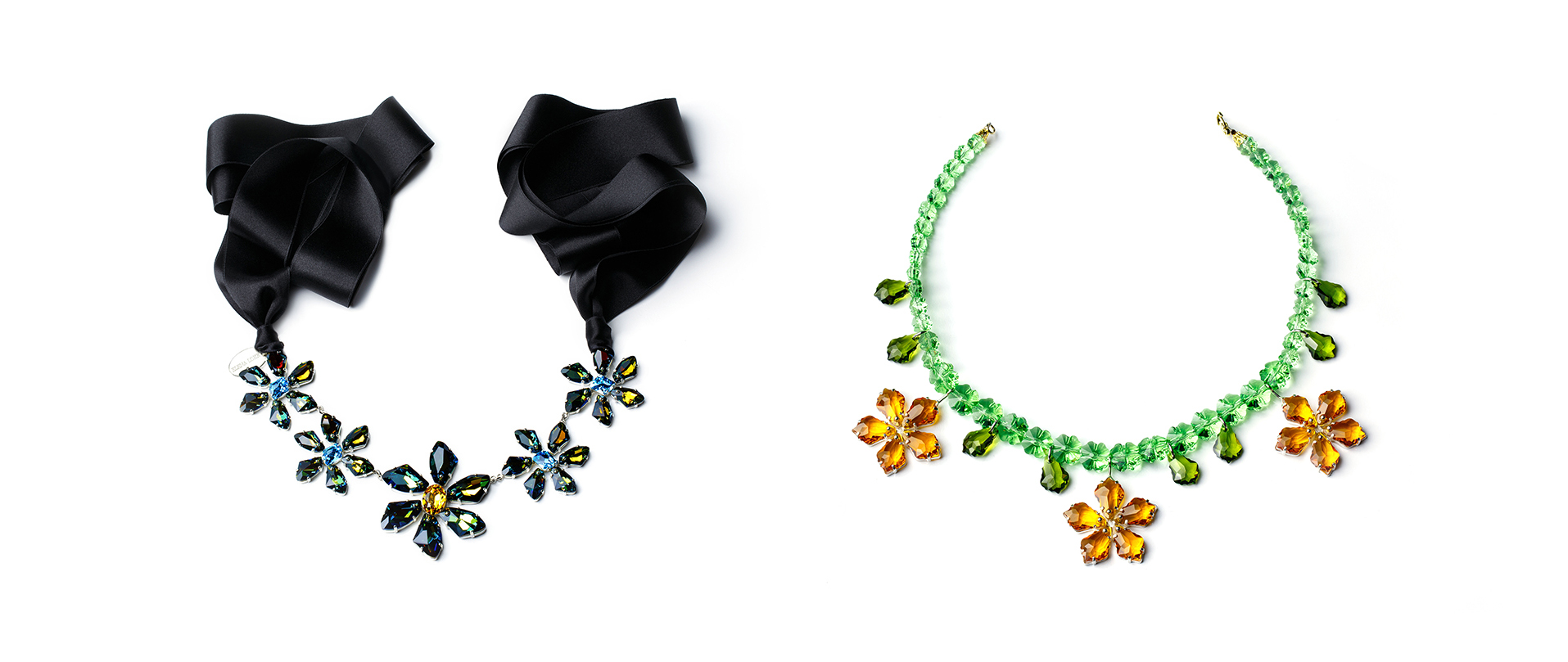 В своих коллекциях Елена обращается к натуральным камням — мраморным агатам, лиловым турмалинам и лазурным авантюринам, которые превращаются в цветущие композиции. С ними соседствуют перламутровые жемчужины и сверкающие кристаллы Swarovski, а еще бархатные и шелковые ленты.