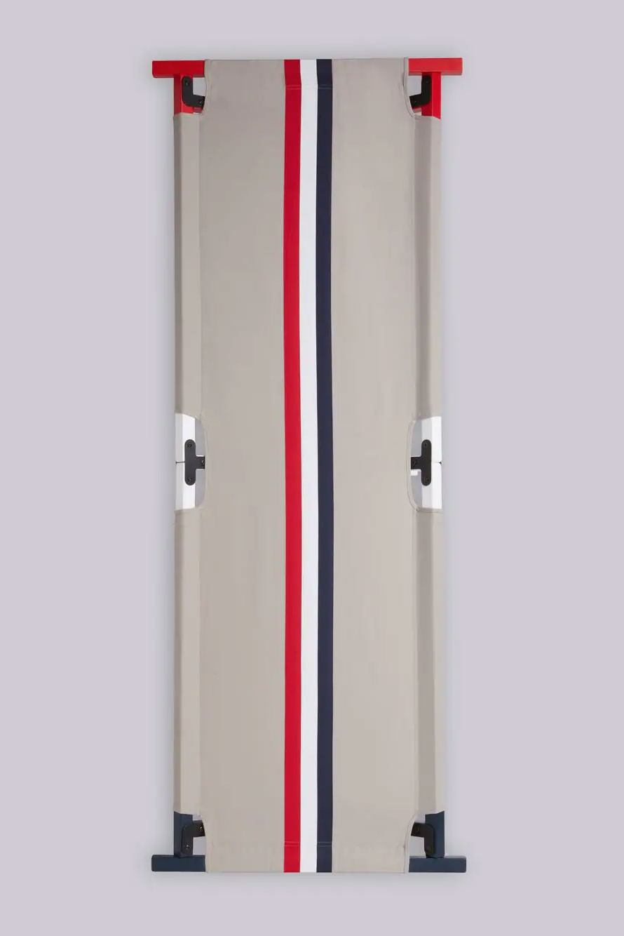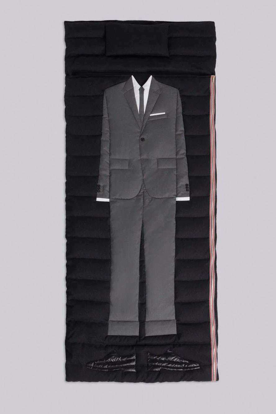 Спальный мешок Thom Browne сделан из смеси шерсти, нейлона, хлопка, полиэстера и других материалов, которые не позволят вам замерзнуть или промокнуть, а также оборудован ножками-подставками. На внешней стороне мешка дизайнер поместил изображение серого мужского костюма и пары туфель, а внутри разукрасил его культовыми полосами красного, синего и белого цветов.