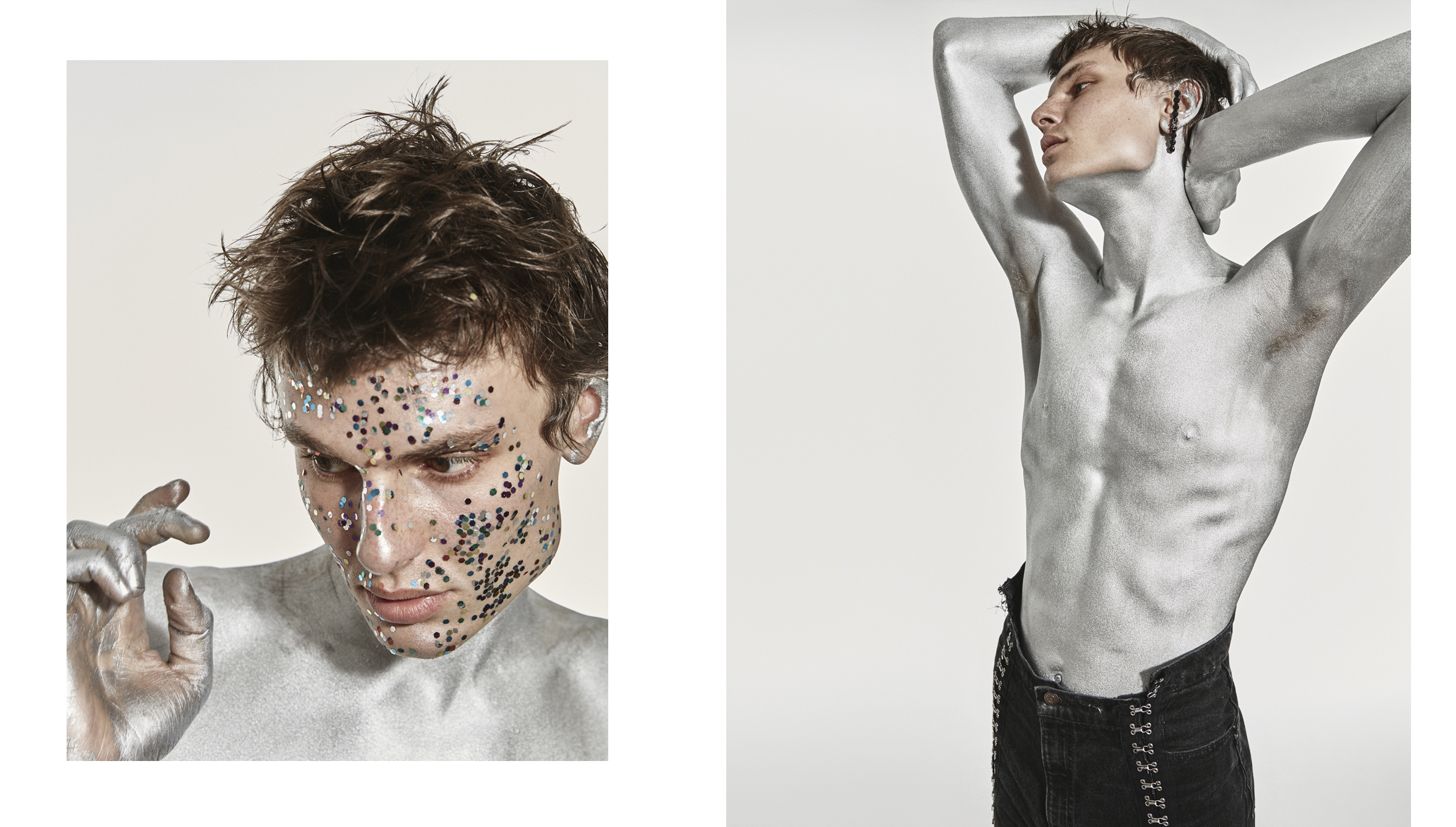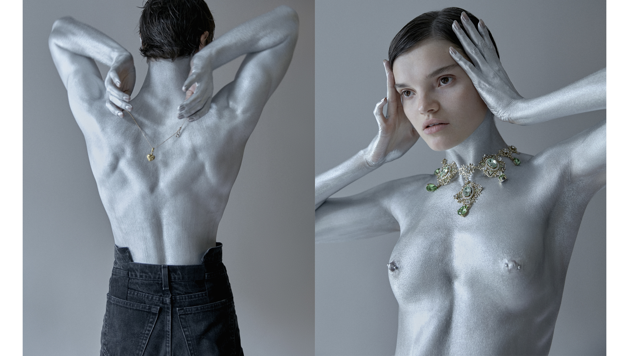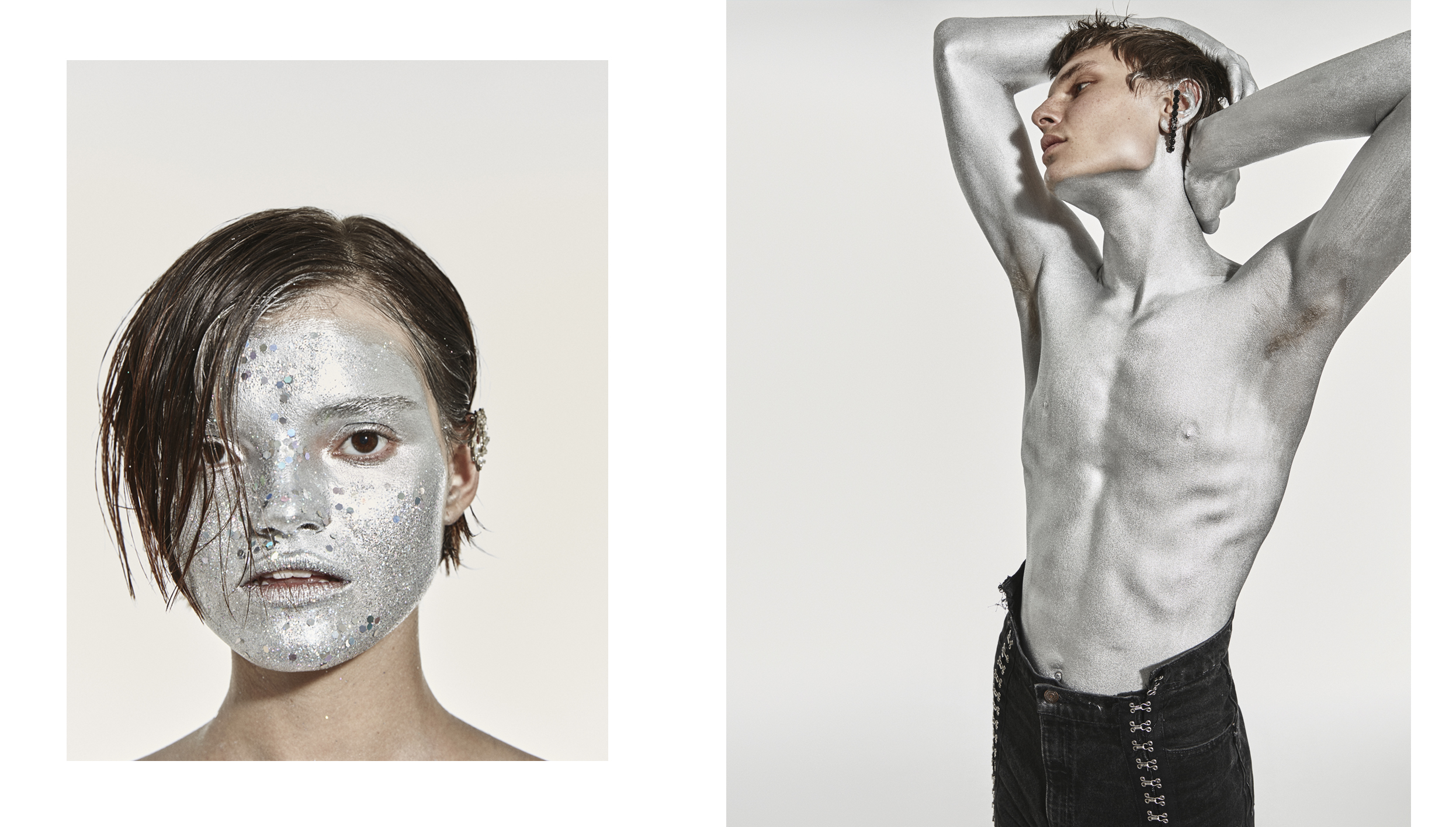 Фотограф Сергей Васильев и визажист Наталья Васильева представляют своих космических героев утопично — в практичном дениме и сверкающих украшениях, но с обнаженным торсом, измазанным серебряной краской. Последняя будто служит прочной защитой от неизвестности Вселенной или грустных будней реальности.