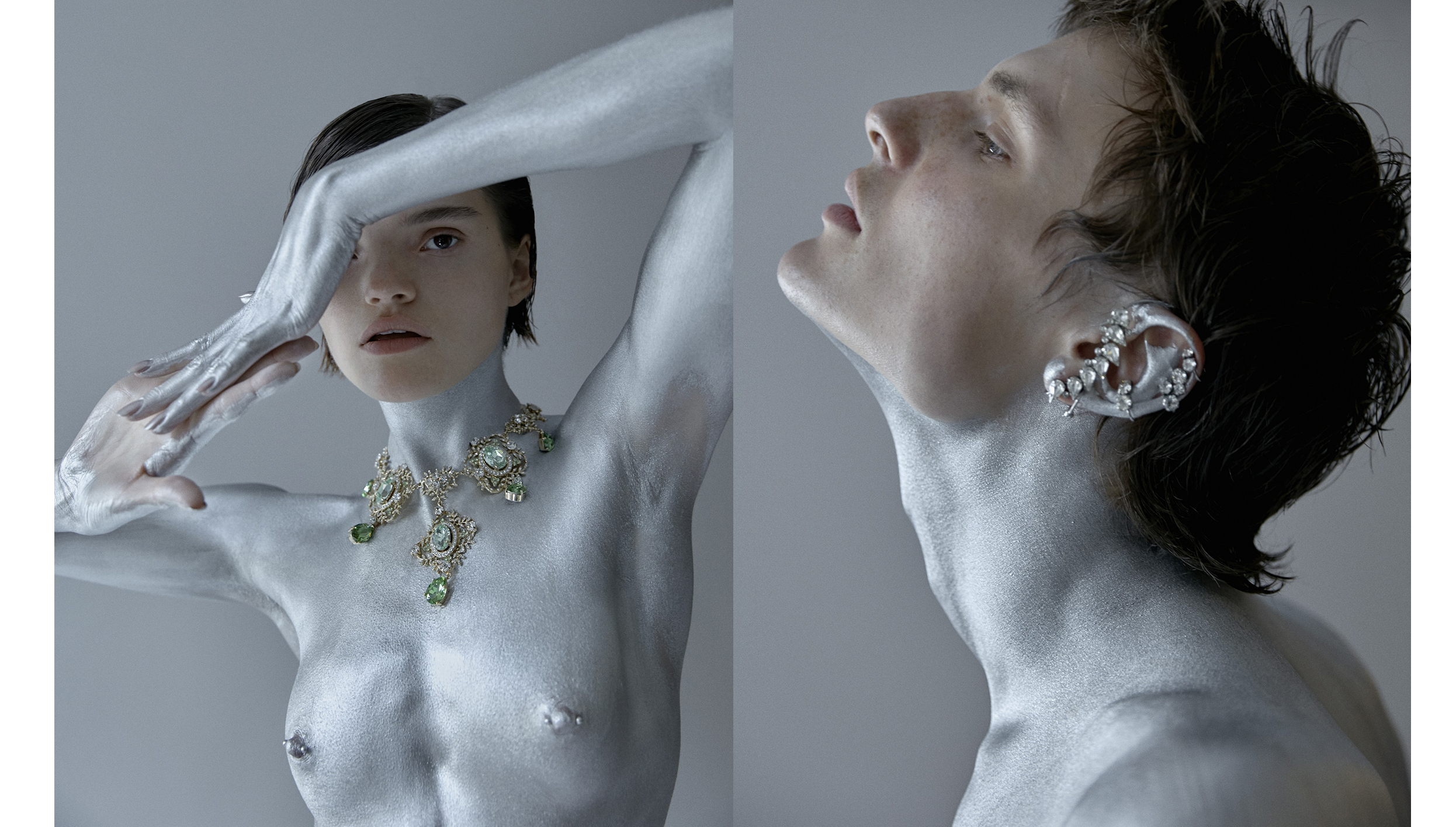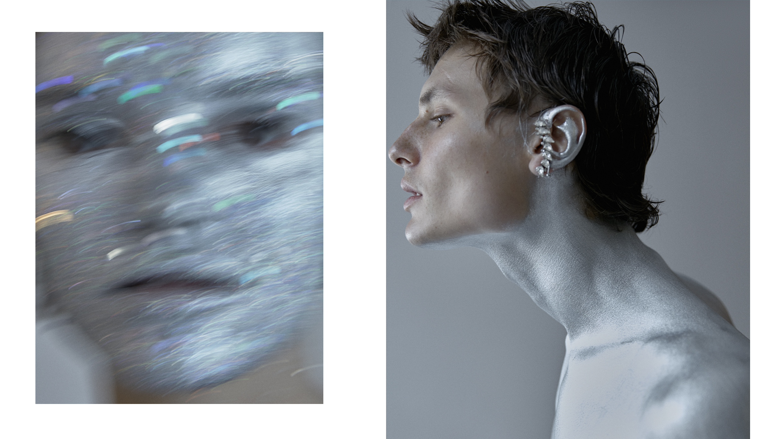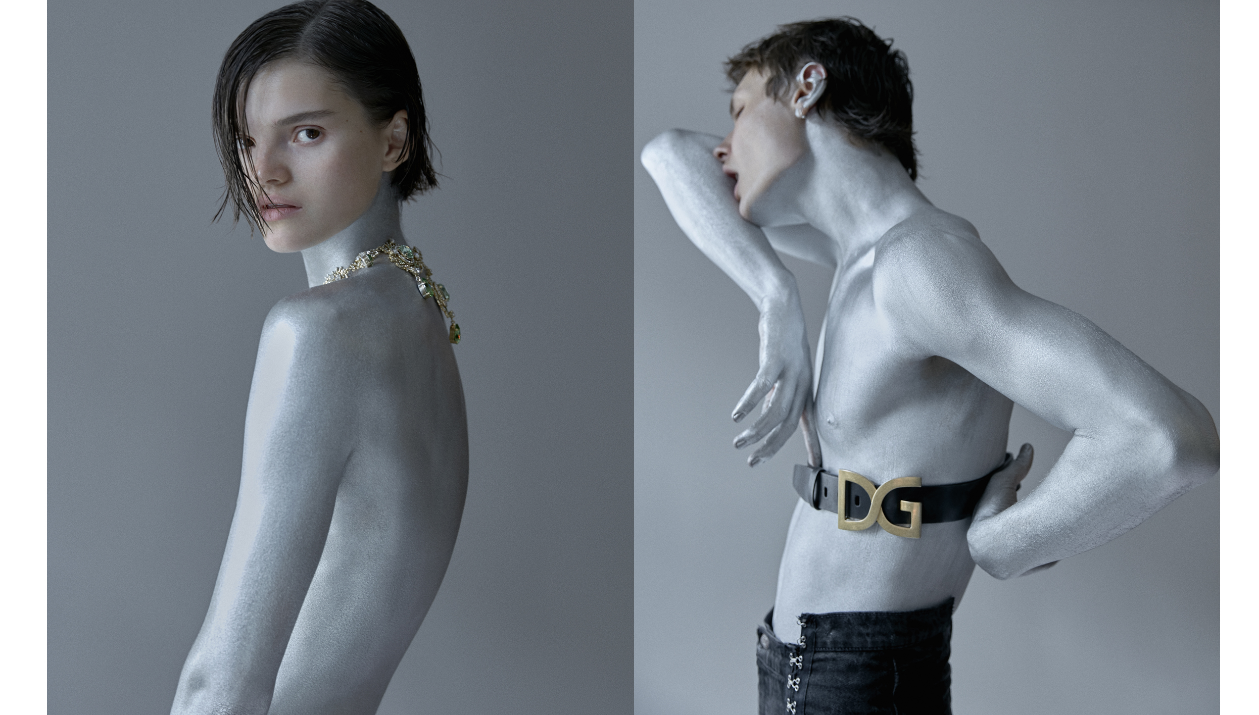 Фотограф Сергей Васильев и визажист Наталья Васильева представляют своих космических героев утопично — в практичном дениме и сверкающих украшениях, но с обнаженным торсом, измазанным серебряной краской. Последняя будто служит прочной защитой от неизвестности Вселенной или грустных будней реальности.