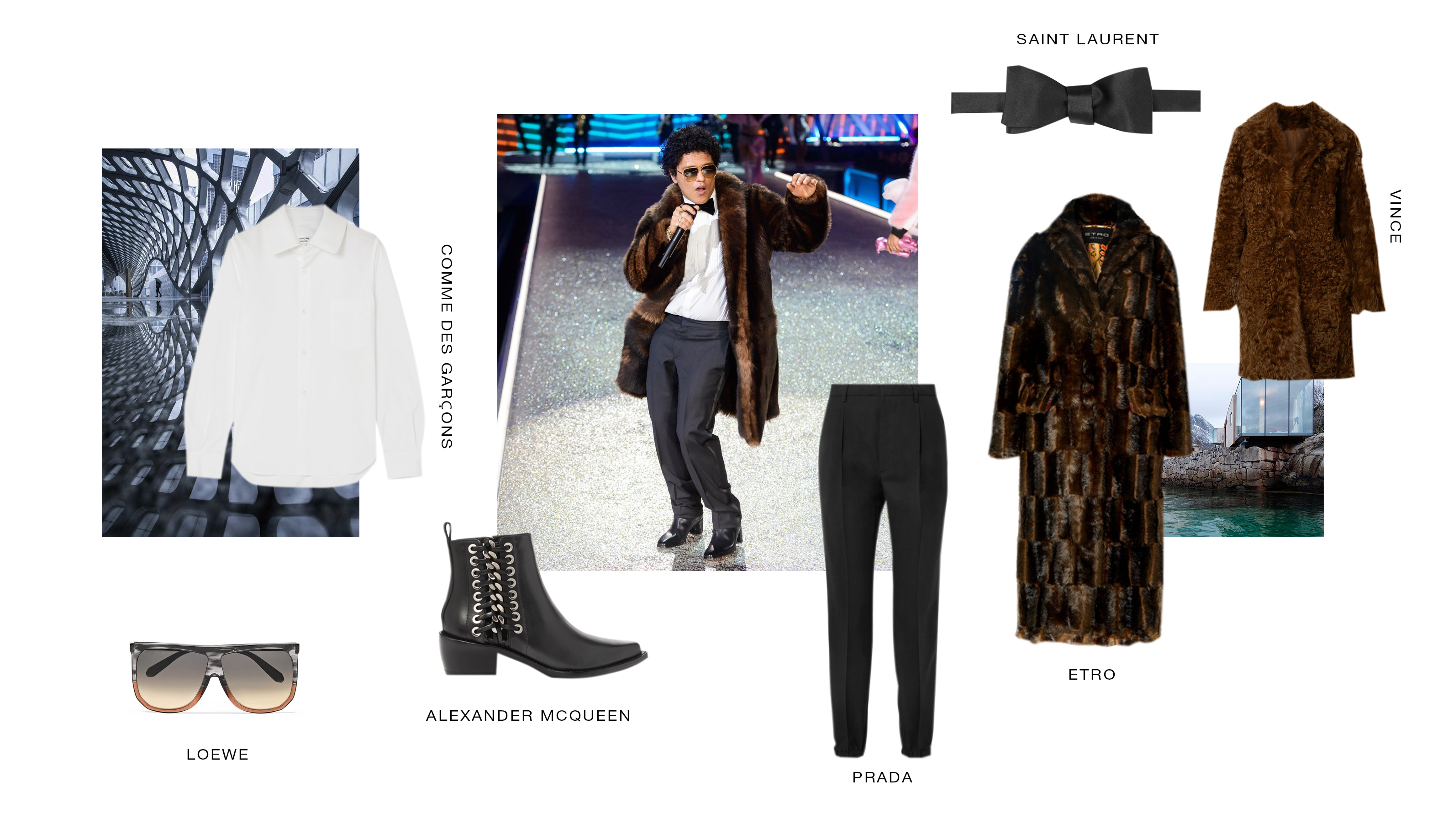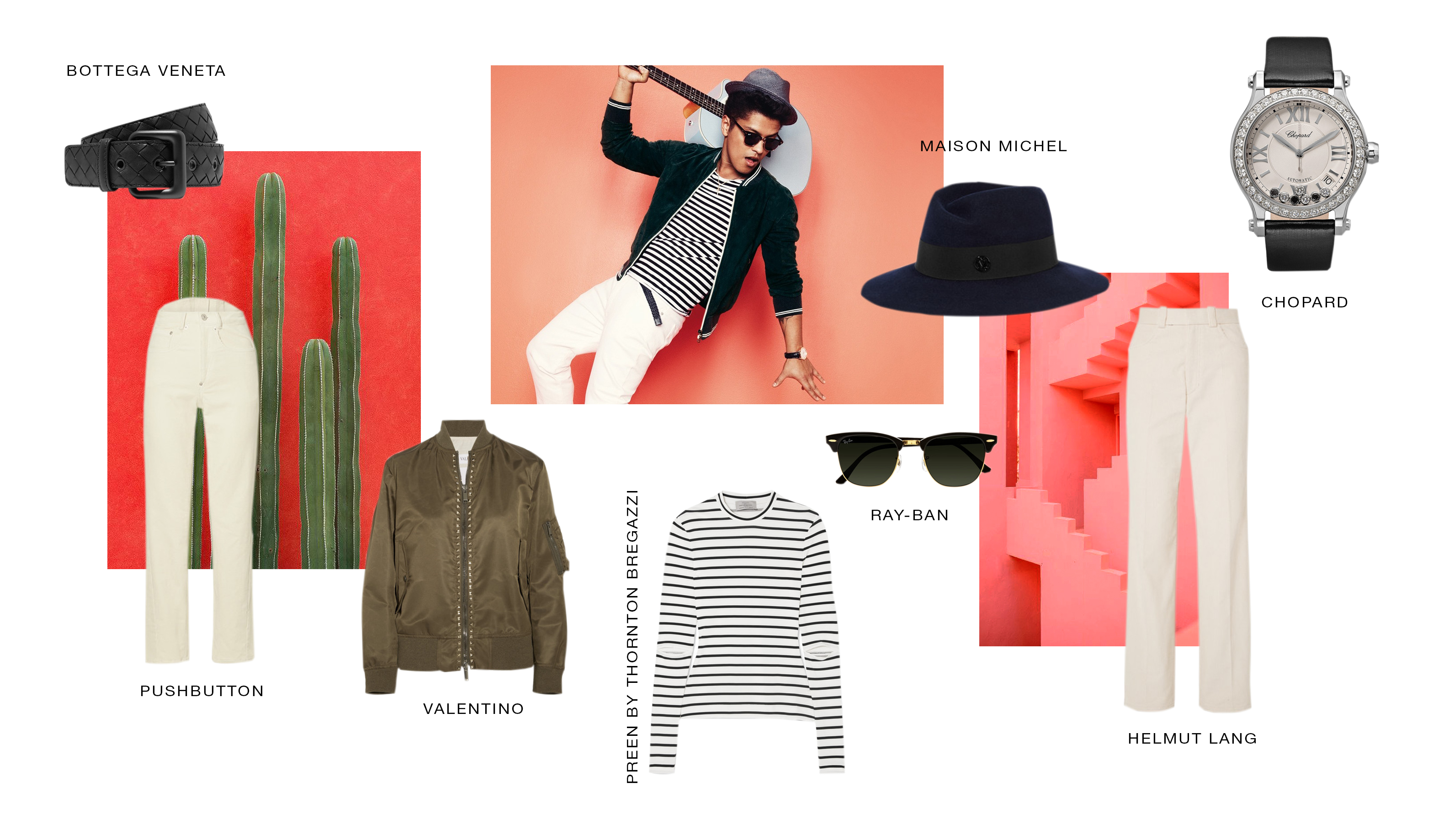 Один из самых успешных поп-исполнителей сегодня, музыкальный продюсер, автор песен и обладатель 11 статуэток “Грэмми” – Бруно Марс ко всему еще и знатный стиляга, известный своей любовью к оригинальным сценическим костюмам и нарядам на официальные мероприятия. Среди его излюбленных приемов – сочетание стилей, обилие аксессуаров и яркие принты. В честь дня рождения талантливого американца, который родился на Гавайях 34 года назад, предлагаем позаимствовать один из его образов – и воплотить его, используя преимущественно женские вещи. Да здравствует унисекс!