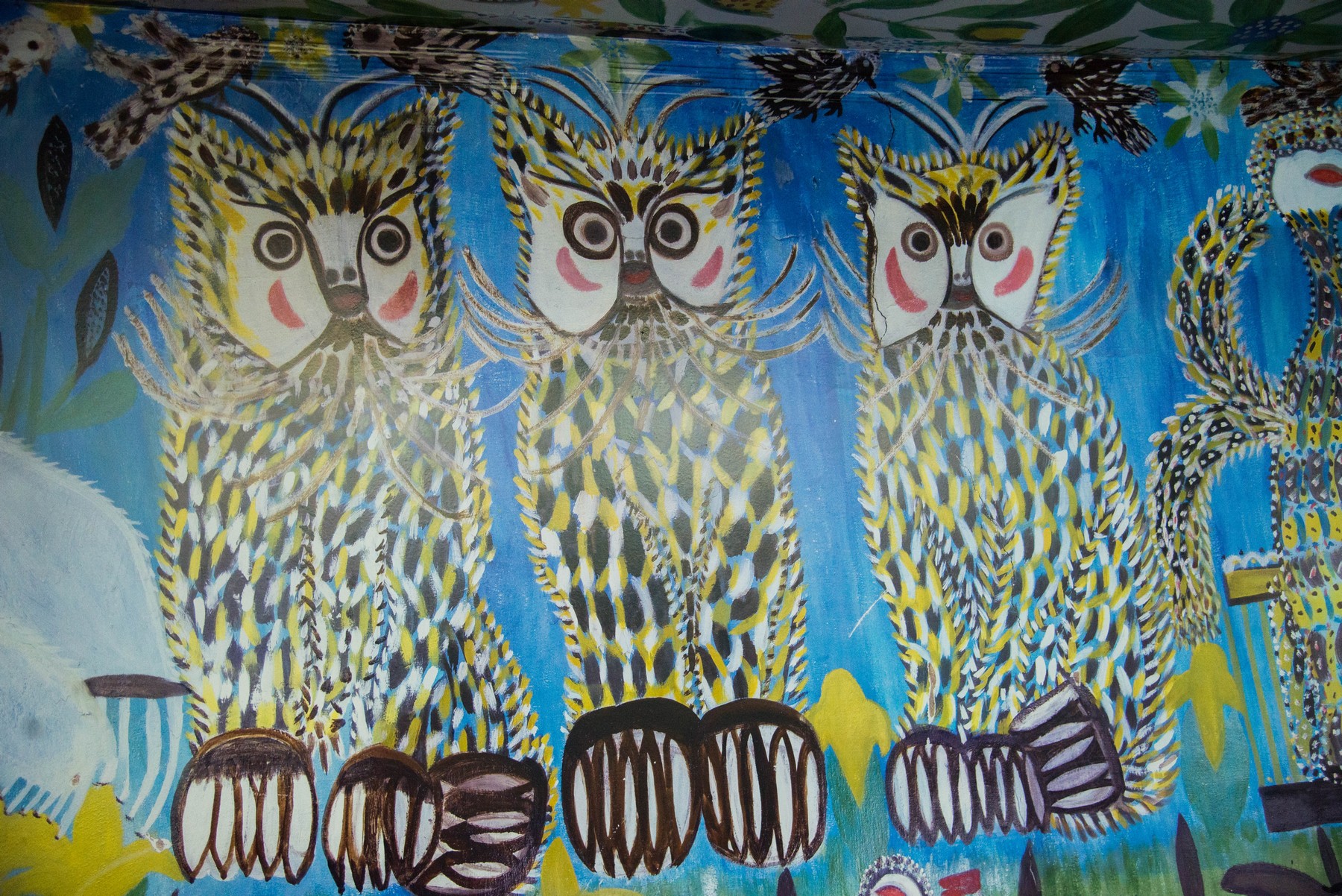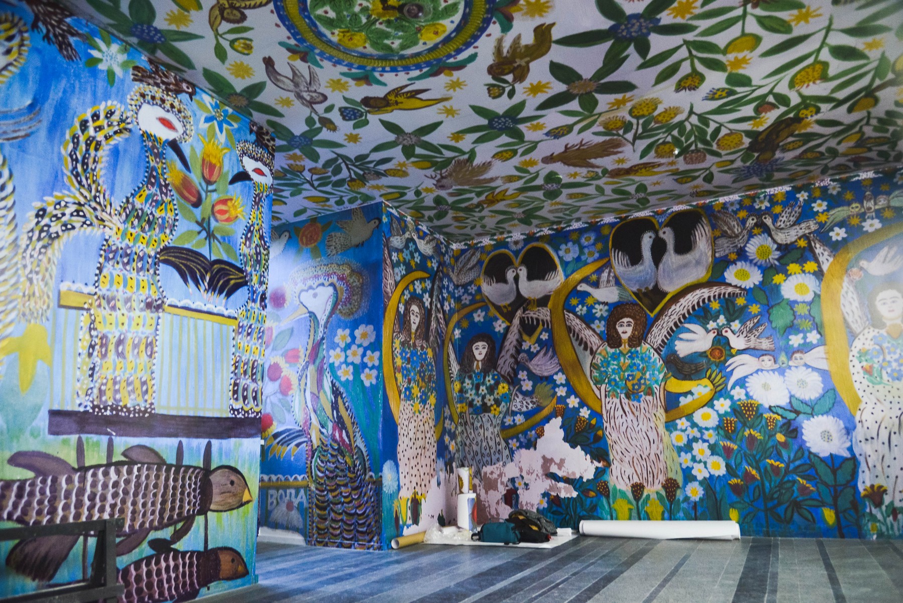 Первое, что увидят посетители, — это "комната" Полины Райко, художницы, которая родилась и выросла в Цюрупинске (нынешний город Олешки в Херсонской области). Всю свою жизнь она была обычной сельской жительницей, но в конце 90-х осталась одна после смерти родных, вдруг начала творить и полностью расписала дом, в котором создала свой собственный мир. Мы съездили в Олешки, сделали фотосъемку росписей и воспроизвели их у нас в центре. Это некий обобщенный художественный образ, по которому видно, как Полина Райко интересно выстраивает свое пространство: у нее есть комнаты, посвященные личному миру, есть религиозные и советские мотивы, есть изображения фантастических животных и портреты ее и мужа, перерисованные со свадебной фотографии. Это старт выставки, ее отправная точка, в которой мы задаемся вопросом пространства.