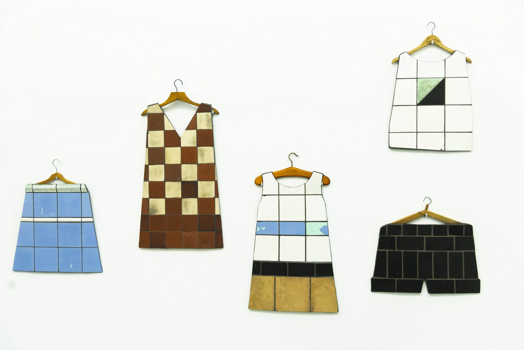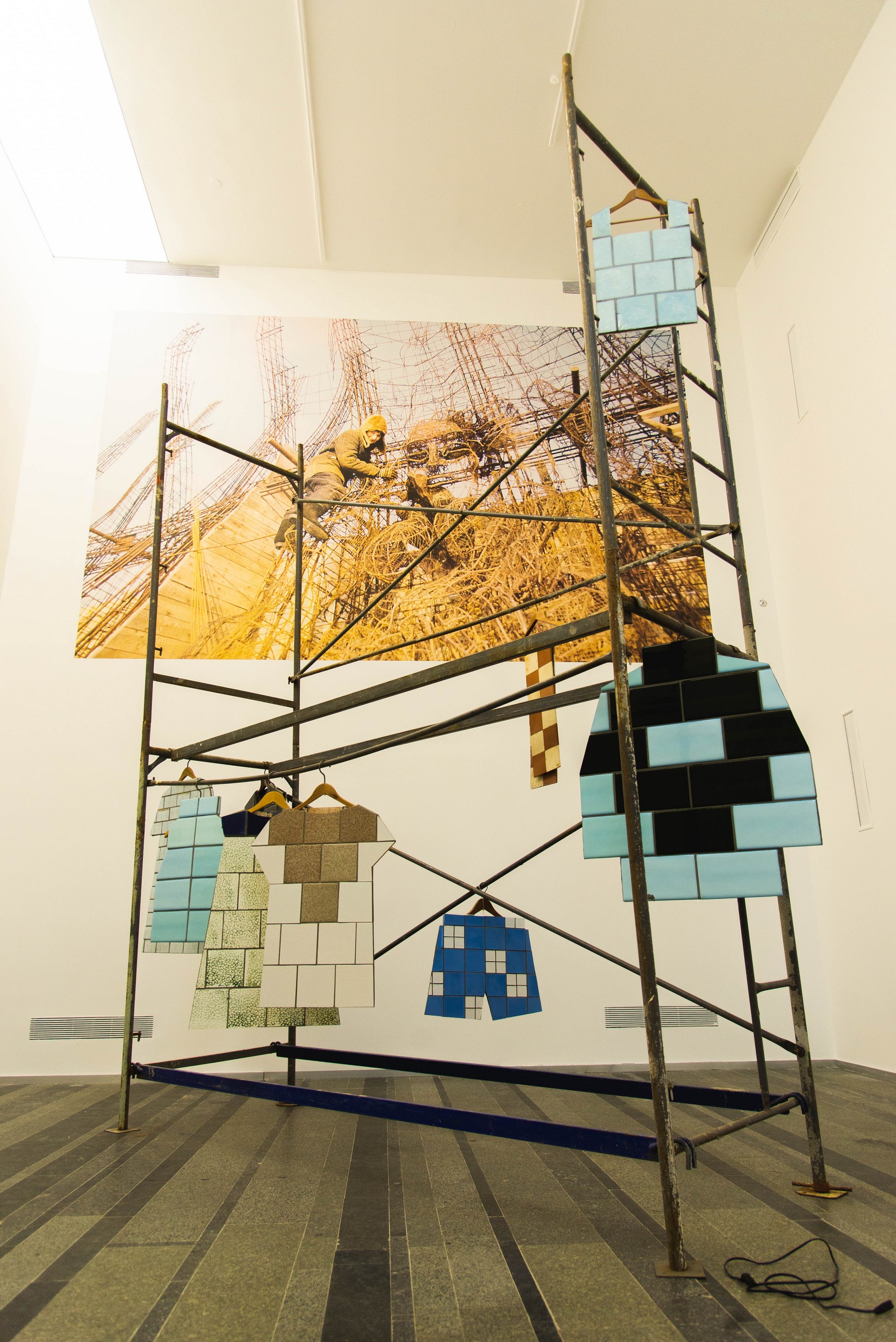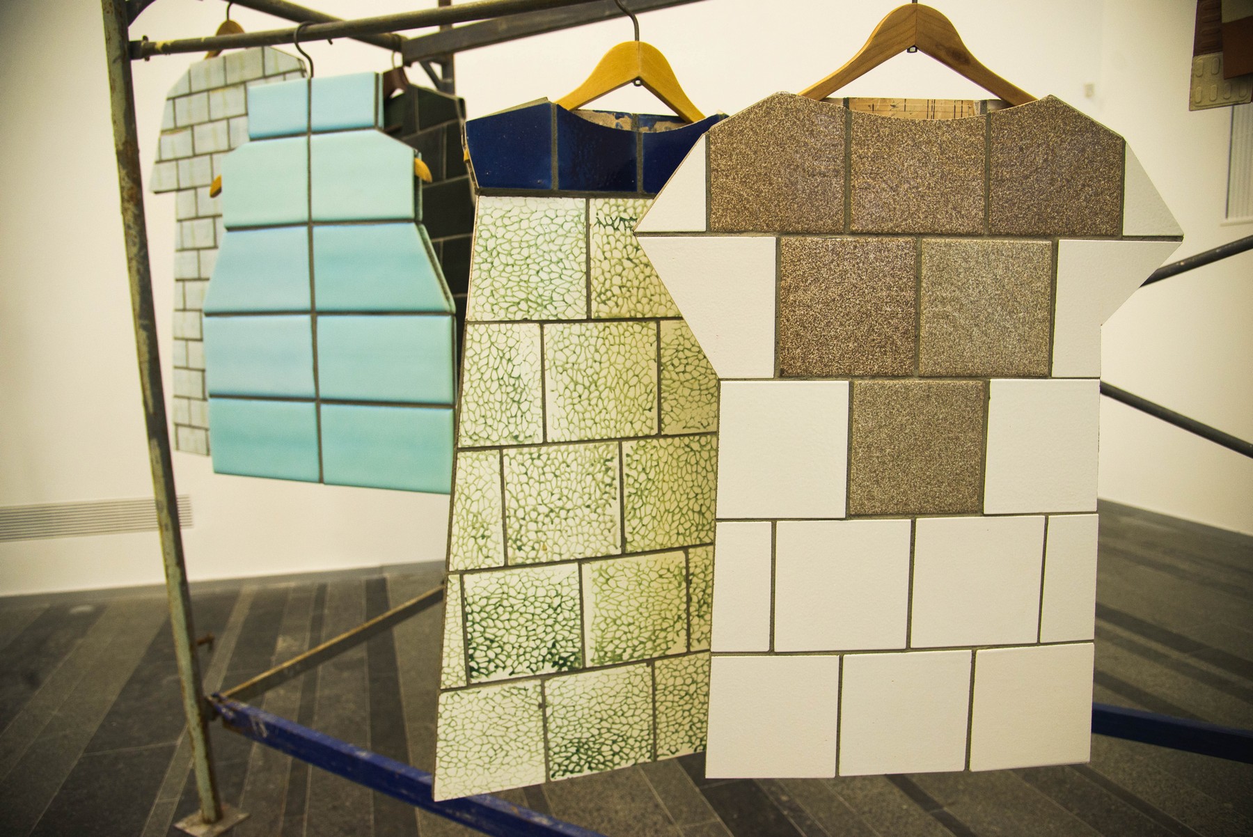 В диалоге с этой фотографией работает инсталляция Second Hand Жанны Кадыровой. Впервые мы показываем все ее части, которые были созданы из аутентичной плитки уже не существующей Киевской кинокопировальной фабрики, Дарницкого шелкового комбината, на месте которого сейчас расположен арт-завод "Платформа" и автостанции села Полесское в Чернобыльской зоне, находящейся в полном запустении.