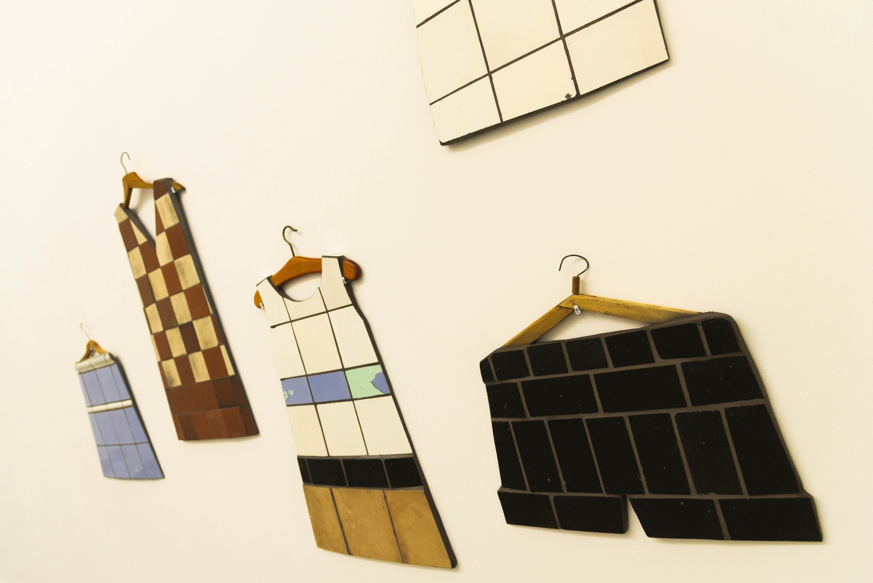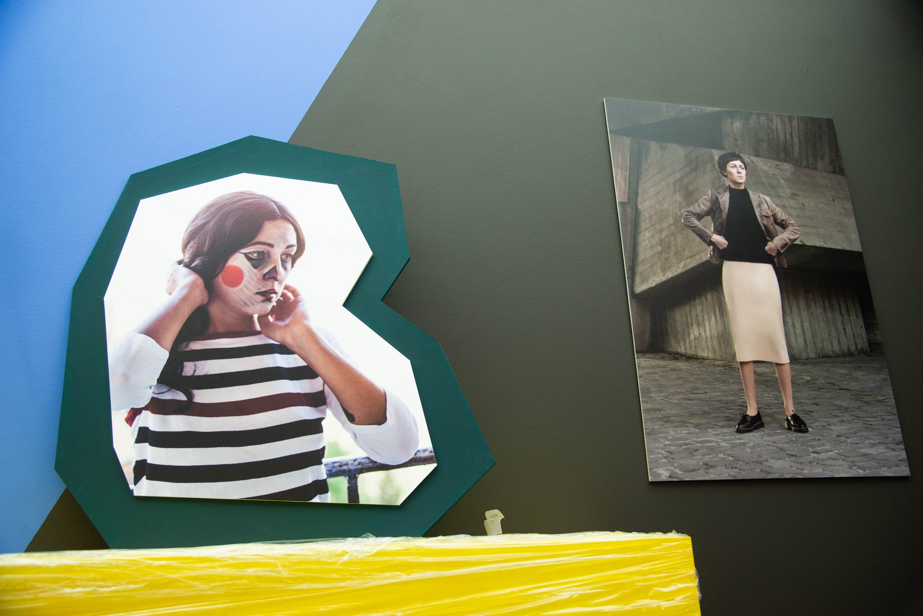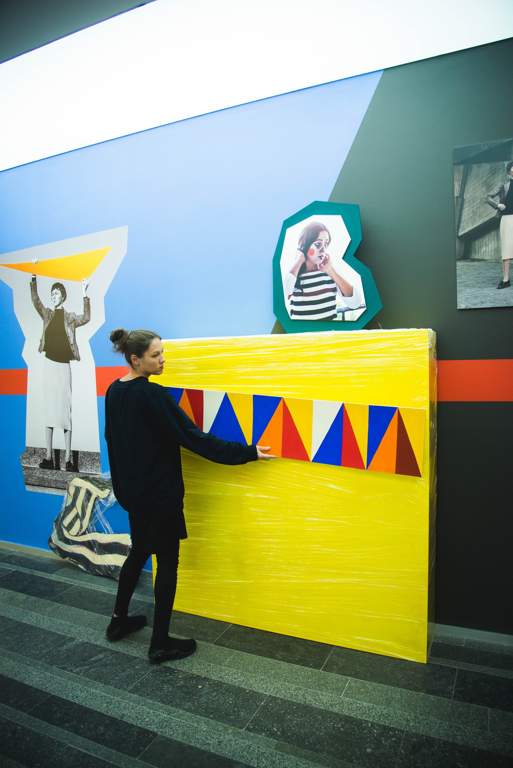 Художница Катя Ермолаева в своем проекте осмысляет искусство 60-х, когда она была очень поведенческой и даже носила некий политический посыл. Это пространственный коллаж, для которого Катя перевоплощается в разные женские образы того времени. В 60-е художники переосмысливали авангард 20-30-х годов, поэтому эта инсталляция выполнена в подобной стилистике.
