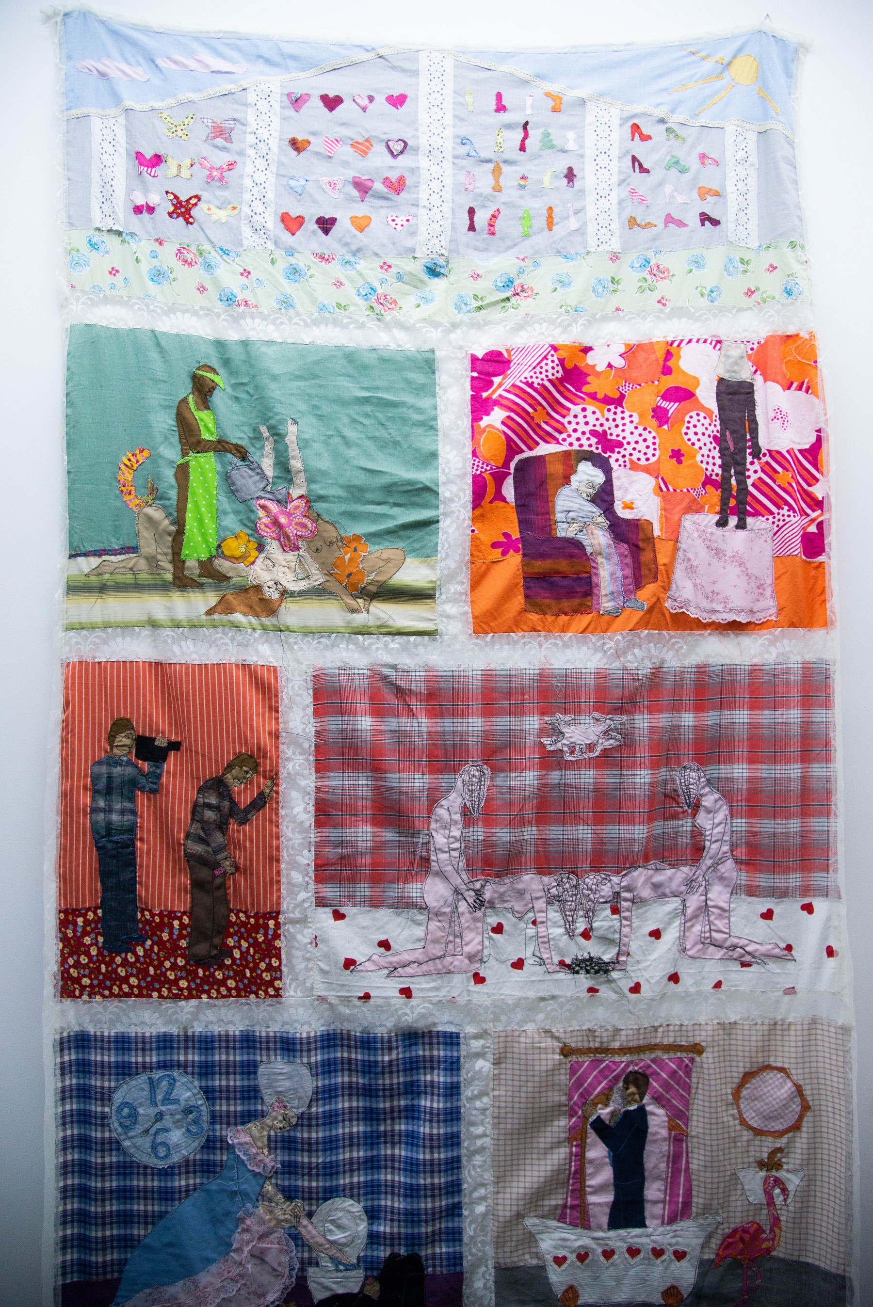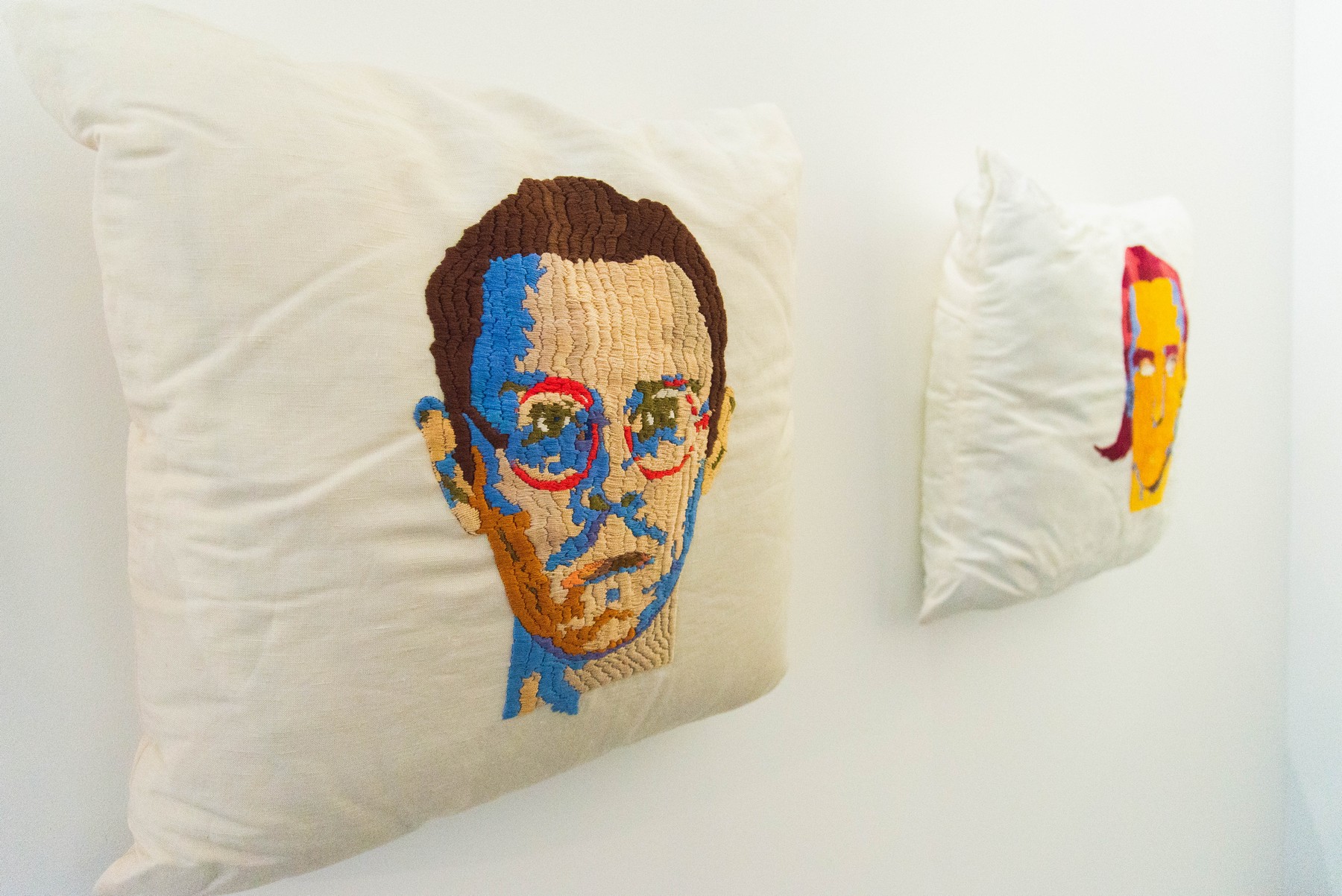 Если бы не наша исследовательница Катерина Яковленко, мы бы никогда не нашли работу Марины Скугаревой, созданную в 1996 году. Катя работала над созданием профайла художницы и, общаясь с ней, обнаружила, что Марина представляла инсталляцию "Мне хорошо» в 96-м в Центре современного искусства Сороса. Нам очень повезло, так как сохранились оригинальные работы и мы их можем сейчас показать: это инсталляция из подушек и металлической кровати, на одной из них вышито изображение самой художницы, и она тем самым говорит «мне хорошо в этом пространстве", на других изображены мужчины – ее муж Олег Тистол и художники Константин Реунов и Николай Маценко (также была подушка с изображением Ольги Свибловой). Скугарева говорит о том, что в 90-е именно арт-сообщество, круг ее близких друзей-художников, позволяло ей творить.