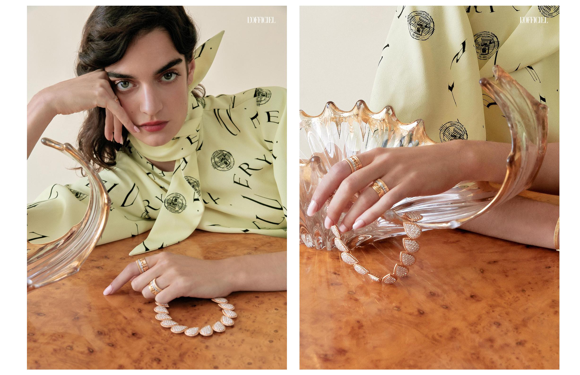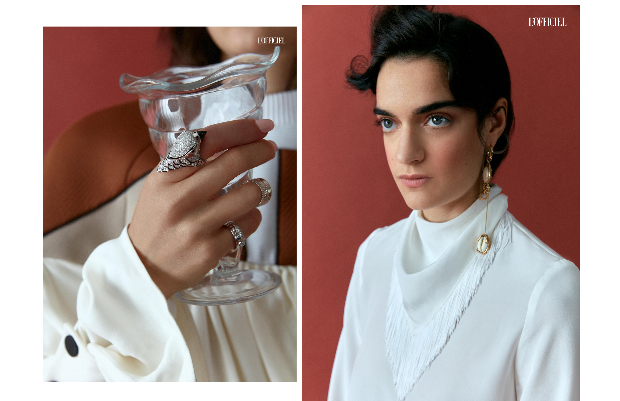 Слева: платье Louis Vuitton, кольцо Faucon из белого золота с бриллиантами, черными сапфирами, перламутром и ониксом, кольца Quatre Radiant Edition из белого золота с бриллиантами, Boucheron