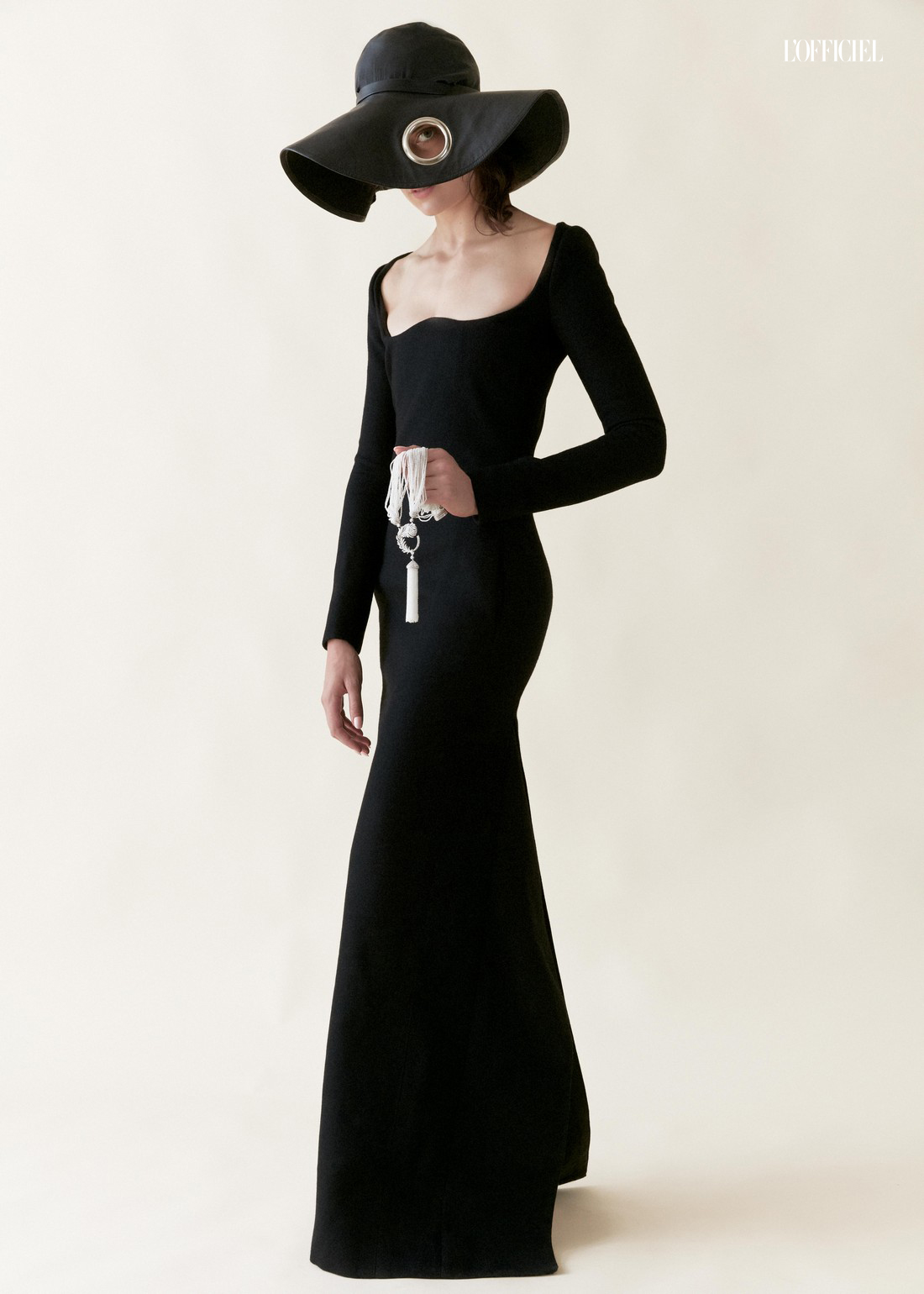 Платье Saint Laurent by Anthony Vaccarello, шляпа Zenabayne, колье Plume de Paon из белого золота с бусинами из топаза и бриллиантовым паве Boucheron