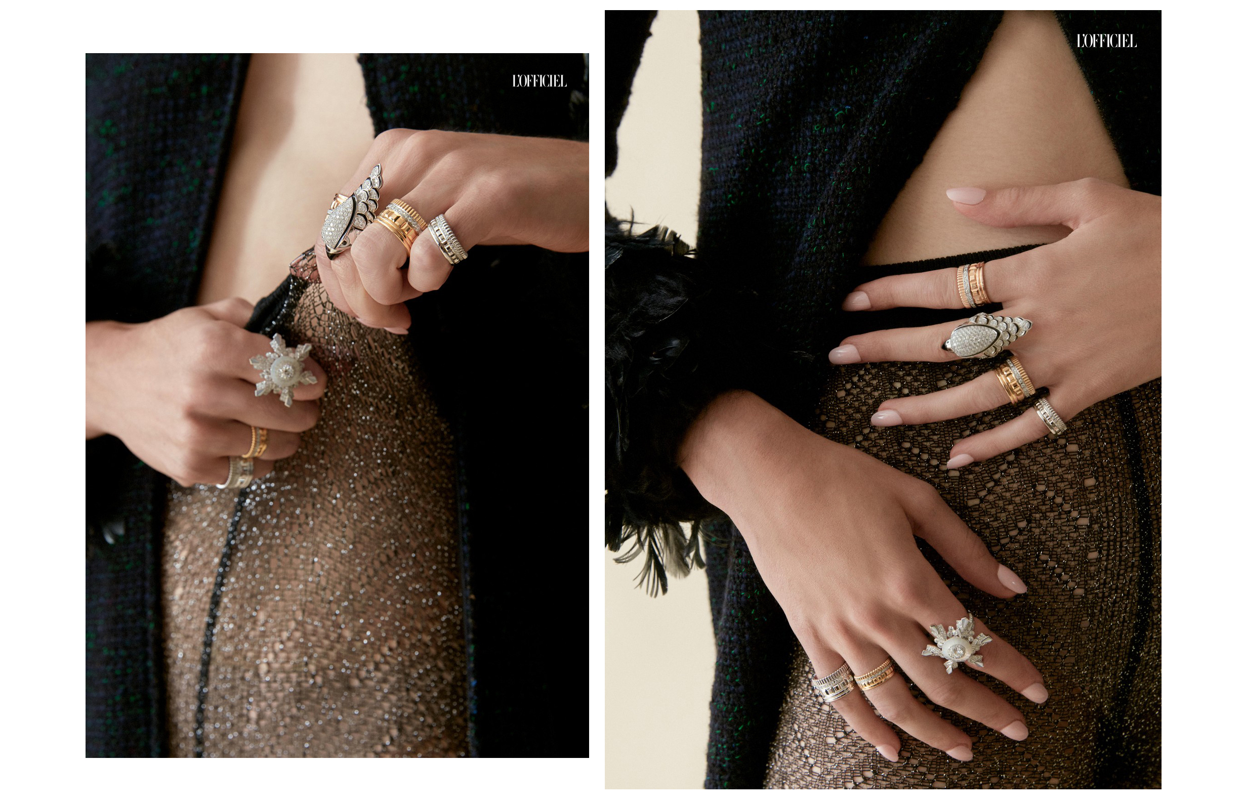 Пиджак с перьями, колготы Chanel, кольца Quatre Radiant Edition из белого, желтого и розового золота с бриллиантами, кольцо Flocon из белого золота с бриллиантами и перламутром, кольцо Faucon из белого золота с бриллиантами, черными сапфирами, перламутром и ониксом, Boucheron