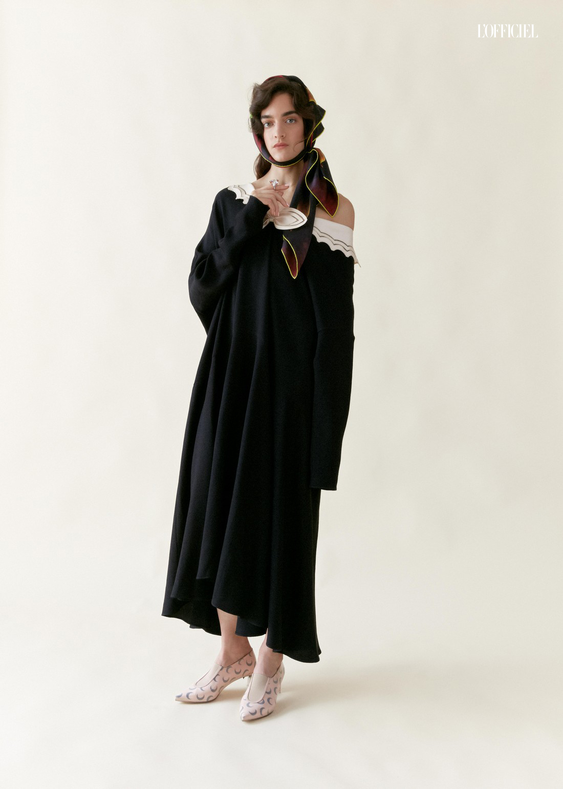 Платье Gucci, шарф Innangelo, туфли Marine Serre, кольцо Hopi из белого и розового золота с морганитами, бриллиантами и сапфирами, Boucheron
