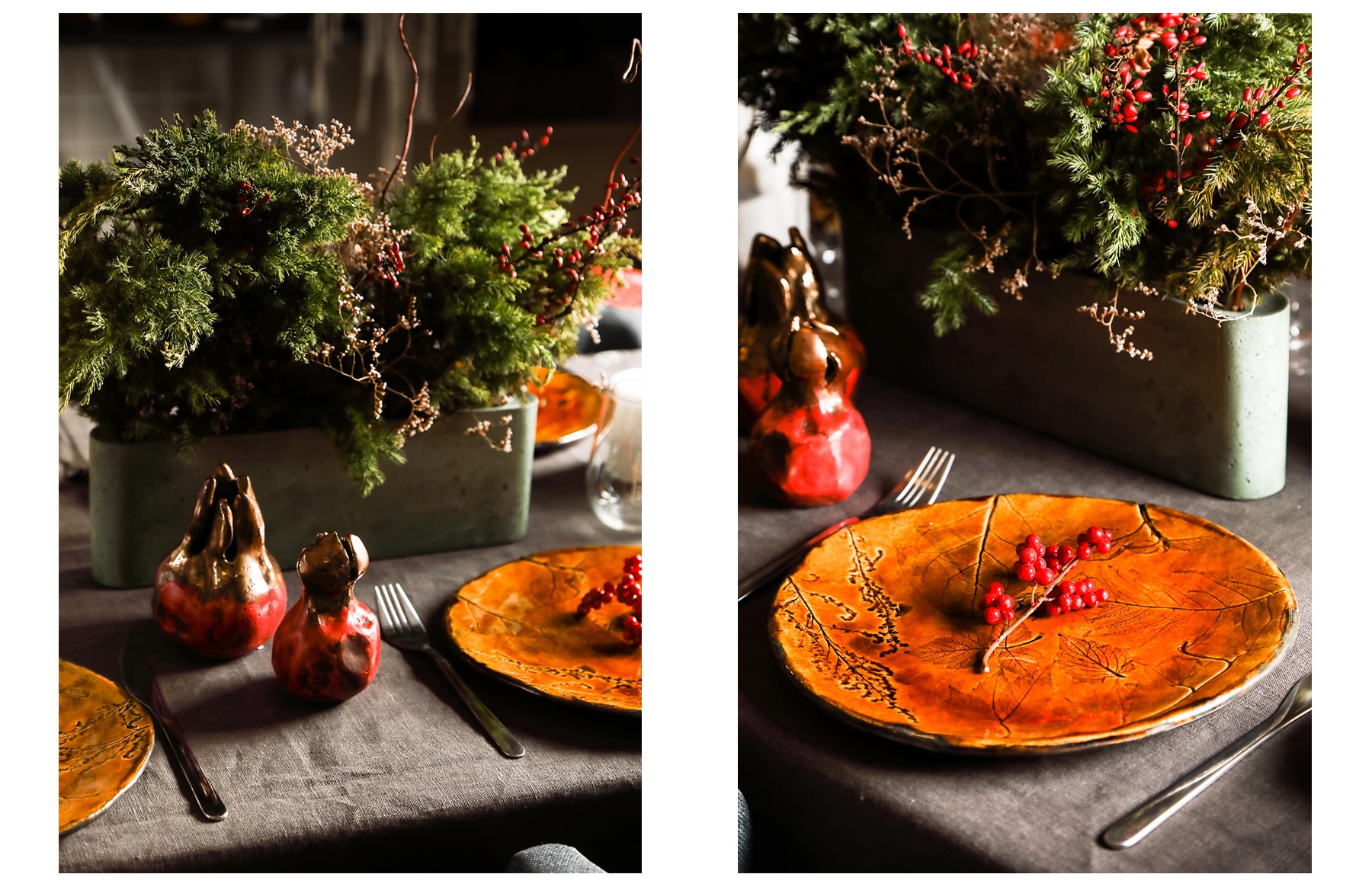 Керамічні тарілки та гранати Lilogos, бетонна ваза з хвоєю Odudlab, свічки ArtFyou та Plamis, керамічний підсвічник Pylnyk, дерев’яний підсвічник Bruht