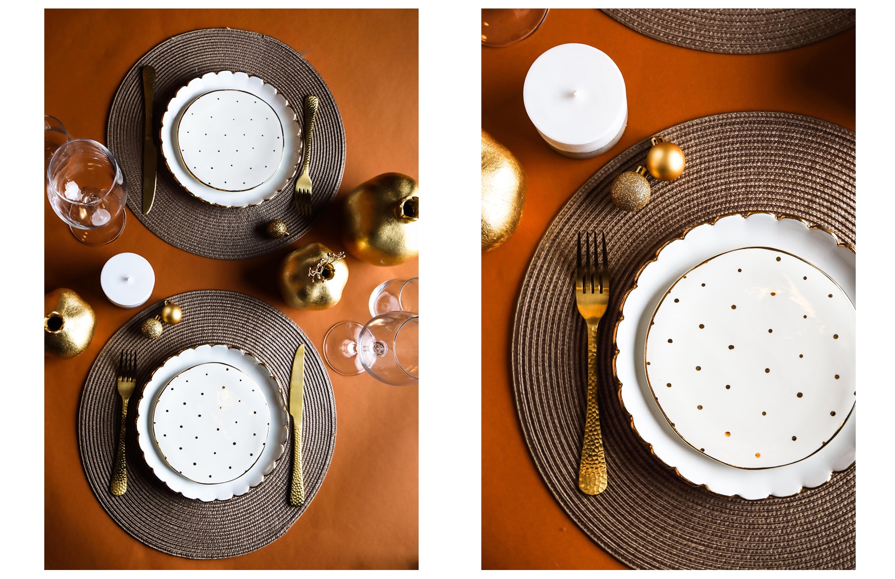 Біла керамічна тарілка Brunch, фарфорова тарілка в горох "Майстренко", свічка ArtFyou, керамічний гранат Keramika Decor