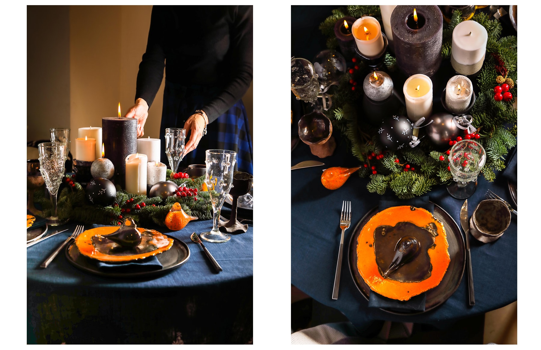 Свічки ArtFyou, скляні пташки, келихи, новорічні іграшки "Щось Цікаве", тарілки Art Room Ceramics та "Восьма комора", чорні келихи Yuriy Musatov, лляна скатертина та серветки Moon Linen