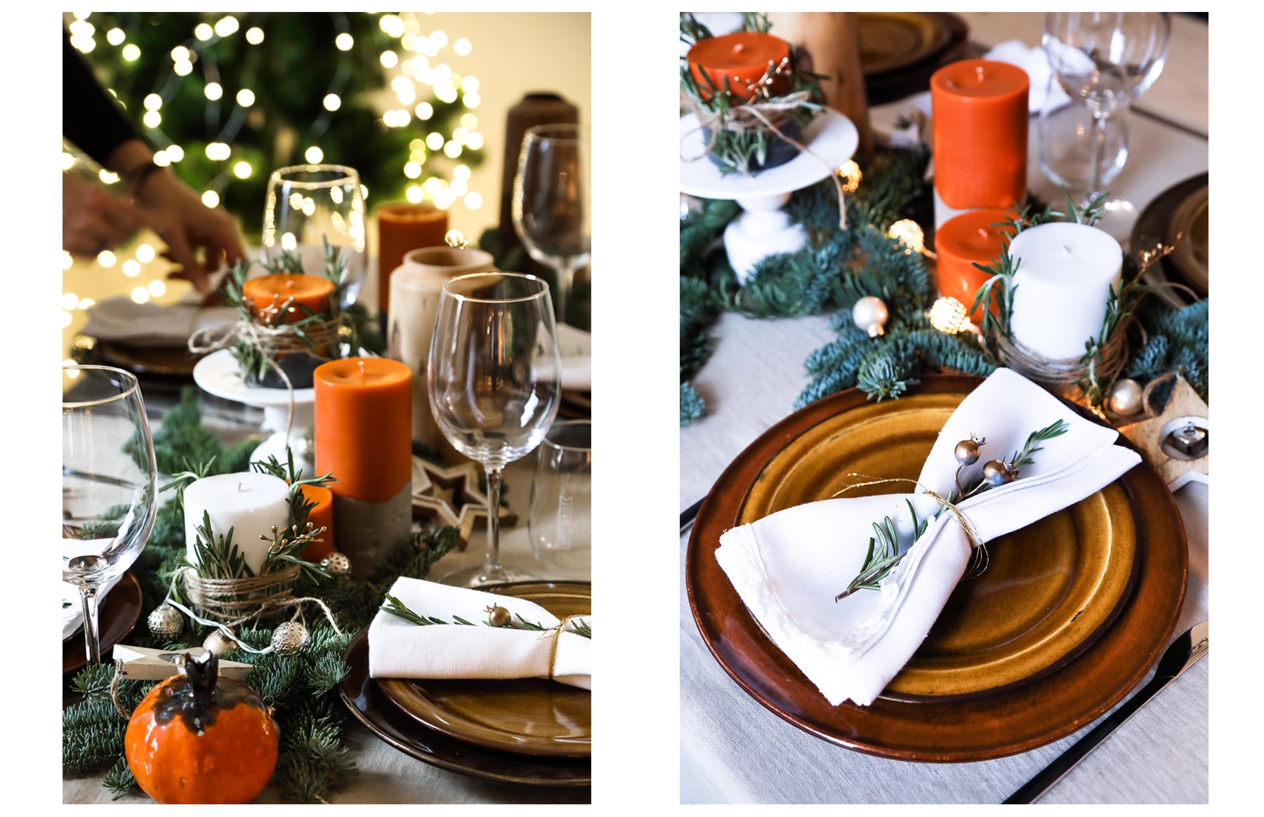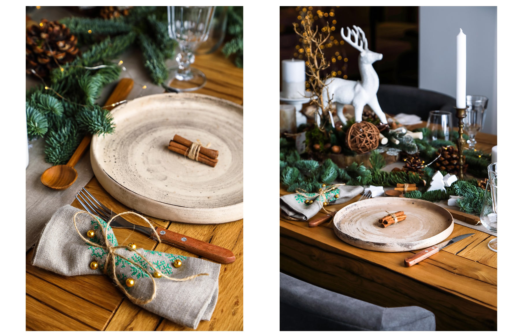 Якщо у вас вдома є дерев’яний стіл – це гарний початок. Не закривайте його природну красу скатертиною, краще використайте лляний ранер. Він стане центром композиції, де й розміститься основний декор. Гілочки сосни чи ялини, яблука, апельсини чи гранати, шишки чи горіхи, палички кориці, грона калини чи шипшини – для декору в стилі natural підійде практично все. До ранера підберіть серветки з льону – перев’язавши їх джутовою мотузкою, отримаєте красивий акцент. Сервіруючи стіл, намагайтесь підібрати усі предмети в одній кольоровій гамі – до текстилю з нефарбованого льону додайте керамічні тарілки з тонкими тріщинками-кракле, дерев’яні ложки, фігурки ялинки, зірочок чи оленя.