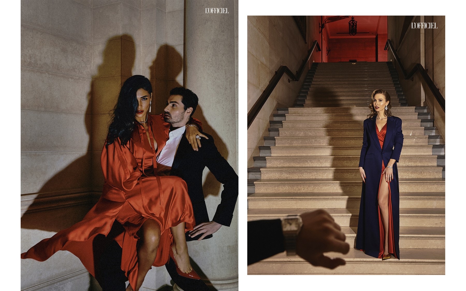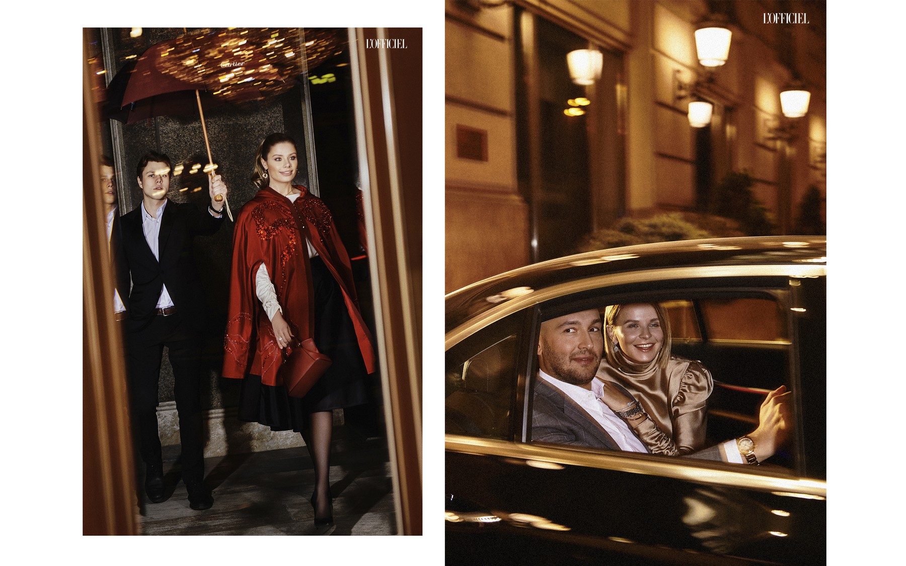 Слева: на Татьяне: кейп Artem Klimchuk, блуза Zimmermann, юбка N°21, сумка Cartier, серьги, колье и кольца Trinity de Cartier, часы Ballon bleu de Cartier из розового и белого золота с бриллиантами, Cartier, туфли, собственность модели. На Александре: пиджак, Ermenegildo Zegna, рубашка, брюки и обувь, собственность модели