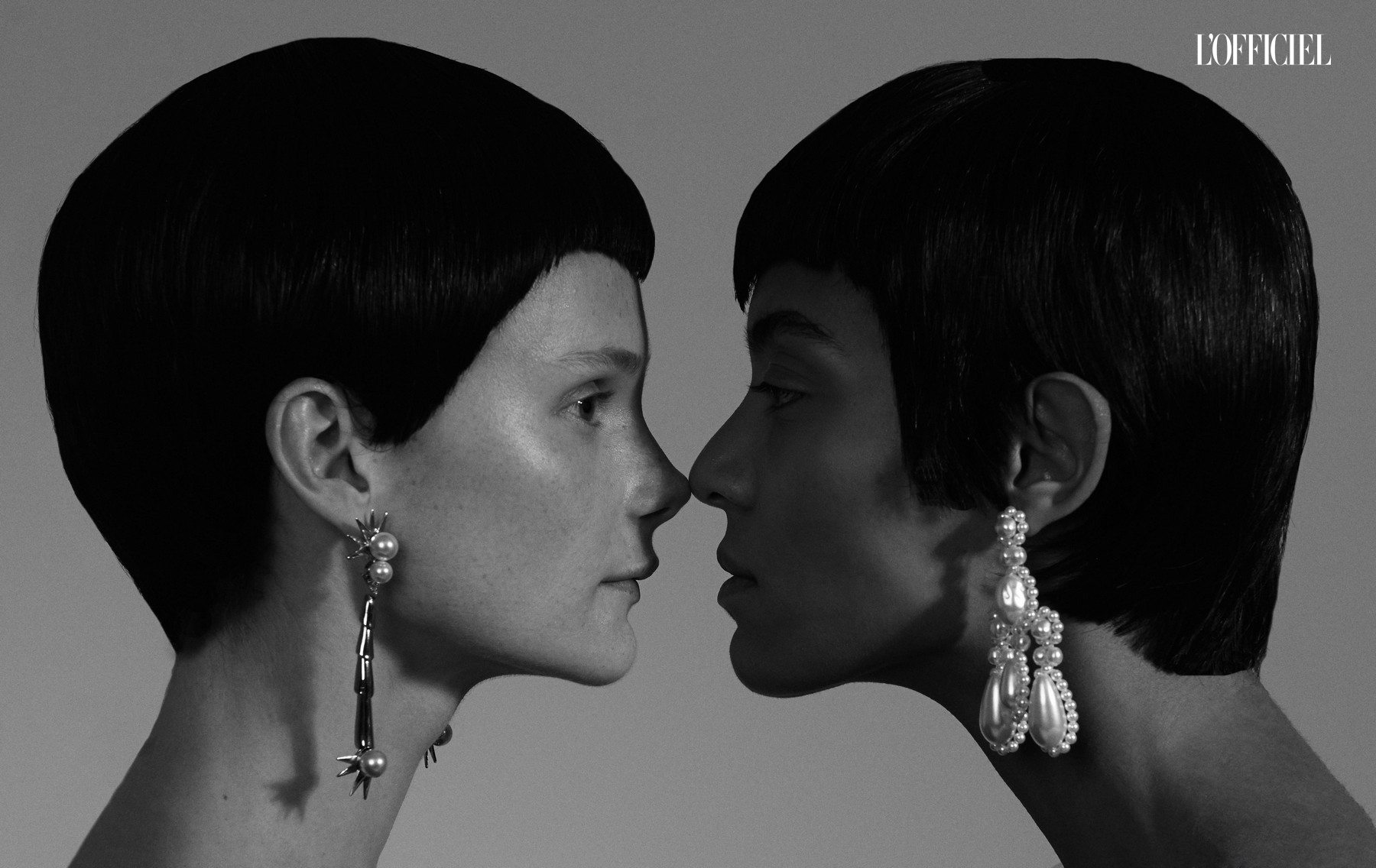 На Анастасии: браслет Cyborg Scorpion, Schield из латуни, декорированный жемчугом и шипами. На Софии: серьги из металла и пластика Simone Rocha