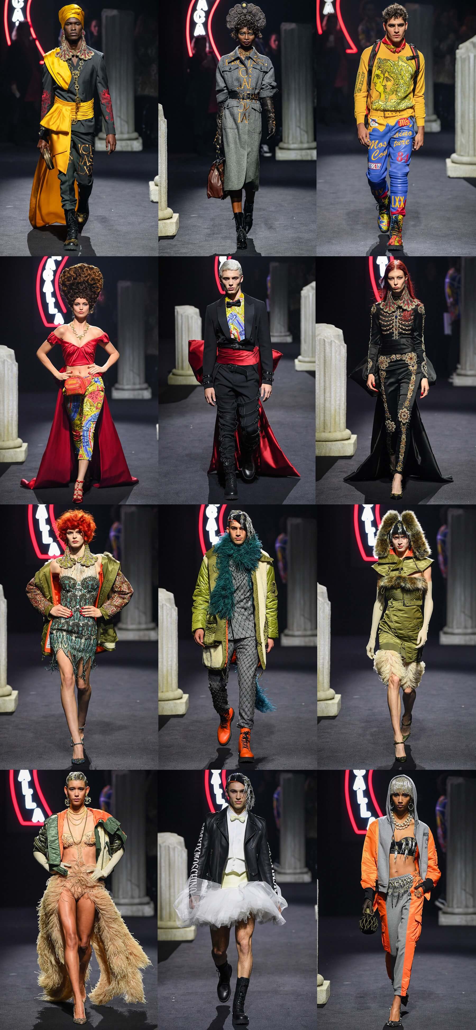 В мужской линии Джереми Скотт воспроизвёл офицерские пальто в технике Тромплёй, мавританские тюрбаны, худи с античными профилями и идеального кроя white-tie-костюмы, декорированные кожаными ремнями и имперскими алыми лентами.