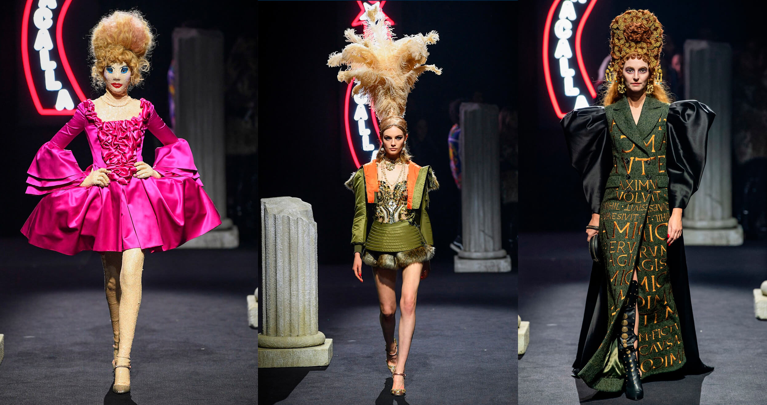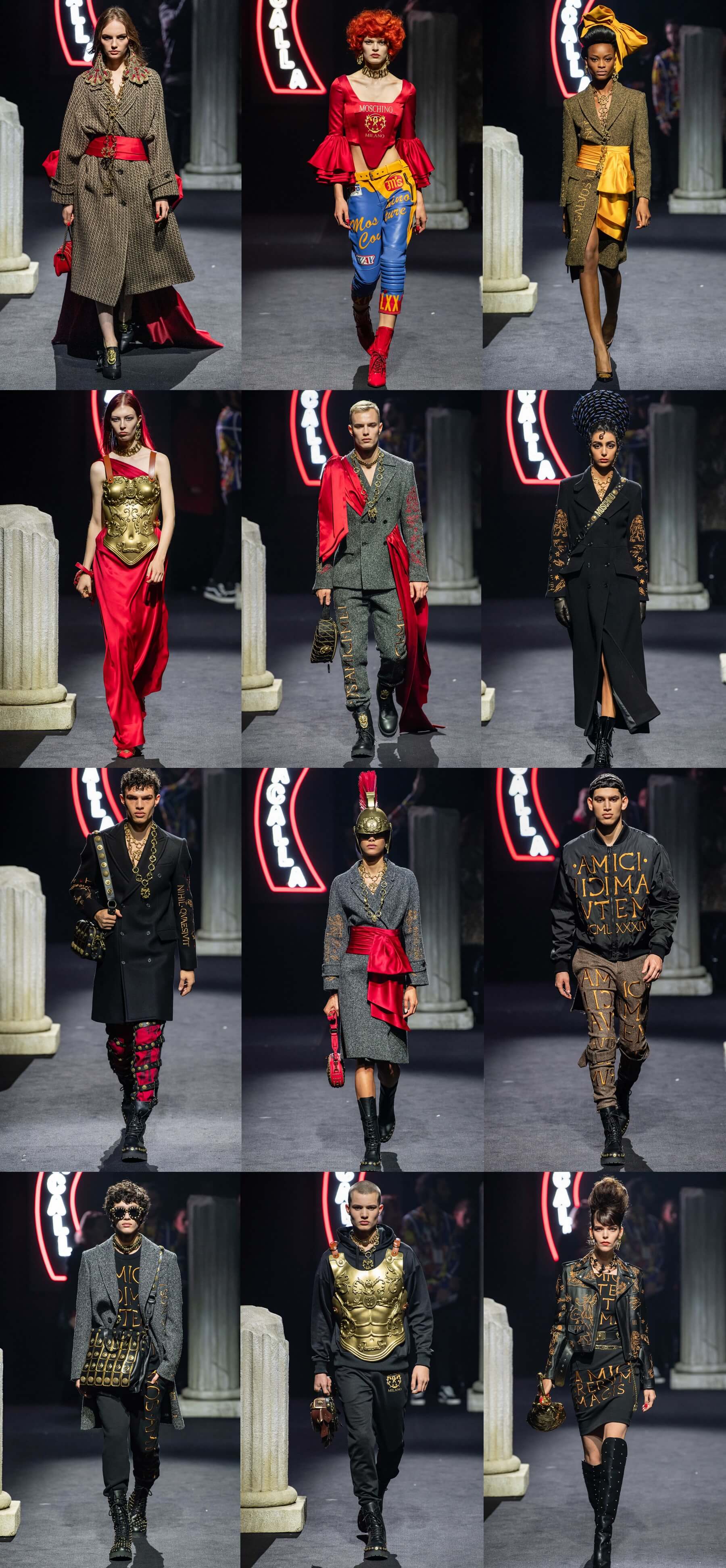 Модели выходили на подиум в образах, цитирующих героев фильмов "Сладкая жизнь", "Сатирикон", "Рим". В костюмах и гиперболизированных париках угадываются также отсылки к фильмам "Амаркорд", "Казанова", "Джульетта и духи".