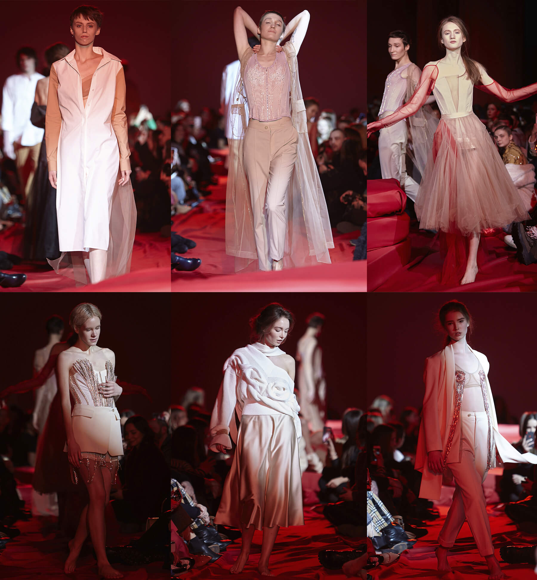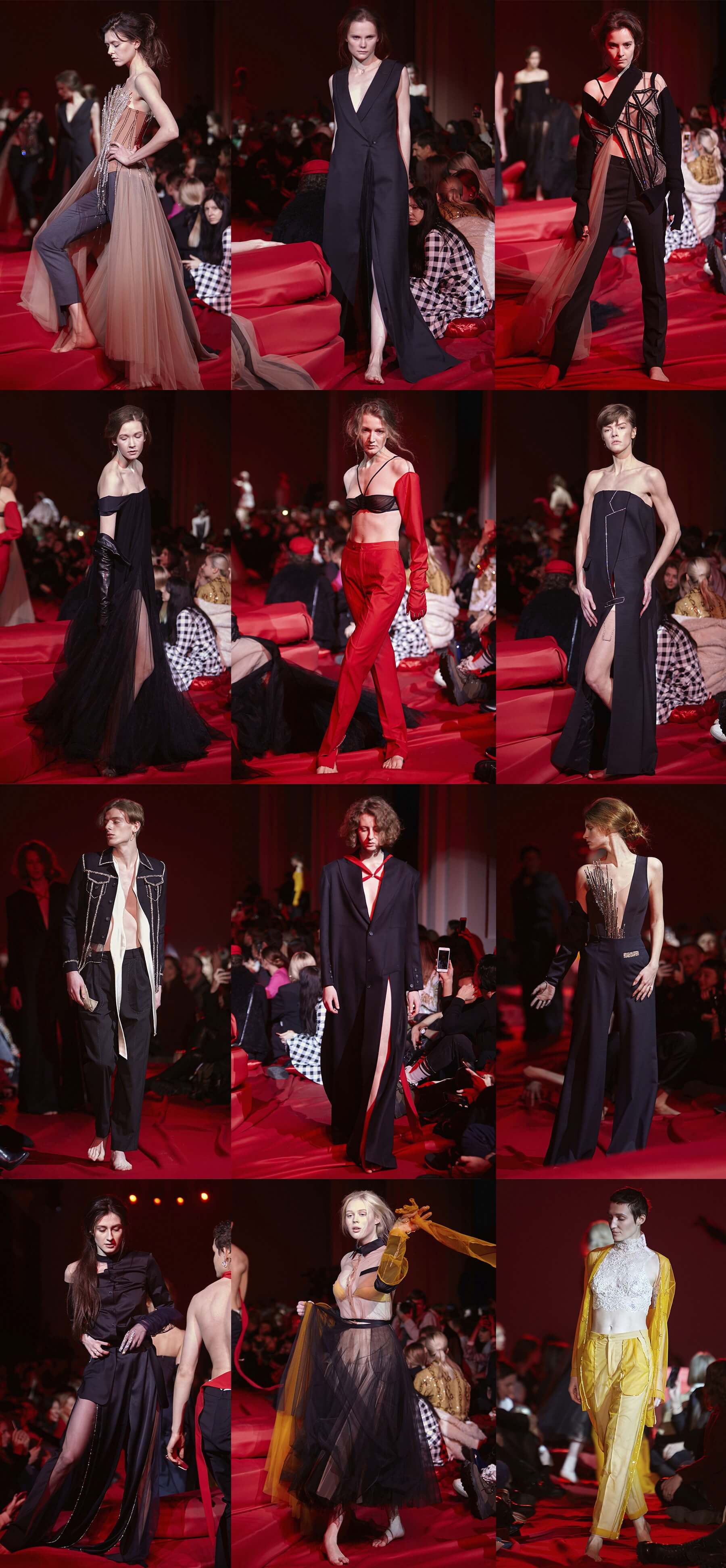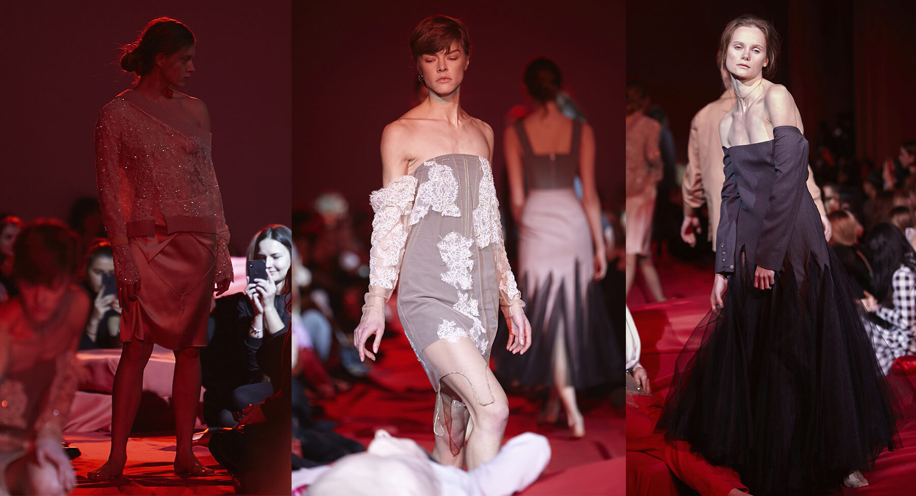 В соблазнительных платьях из десятков метров тюля, шелка и россыпи кристаллов девушки то царственно и игриво расходились в стороны, взаимодействуя с гостями показа, то извивались, будто в изнеможении прямо по алому подиуму. Модели также выходили парами, бережно опуская друг друга на матрасы, горой возвышающиеся в конце подиума, что выглядело скорее трогательно, чем агрессивно сексуально.