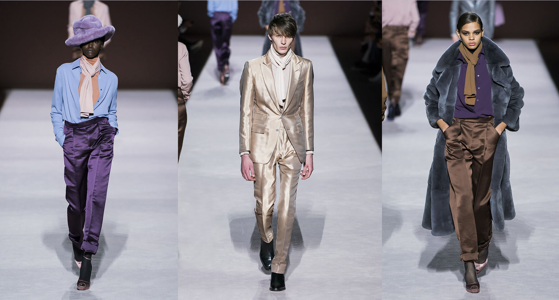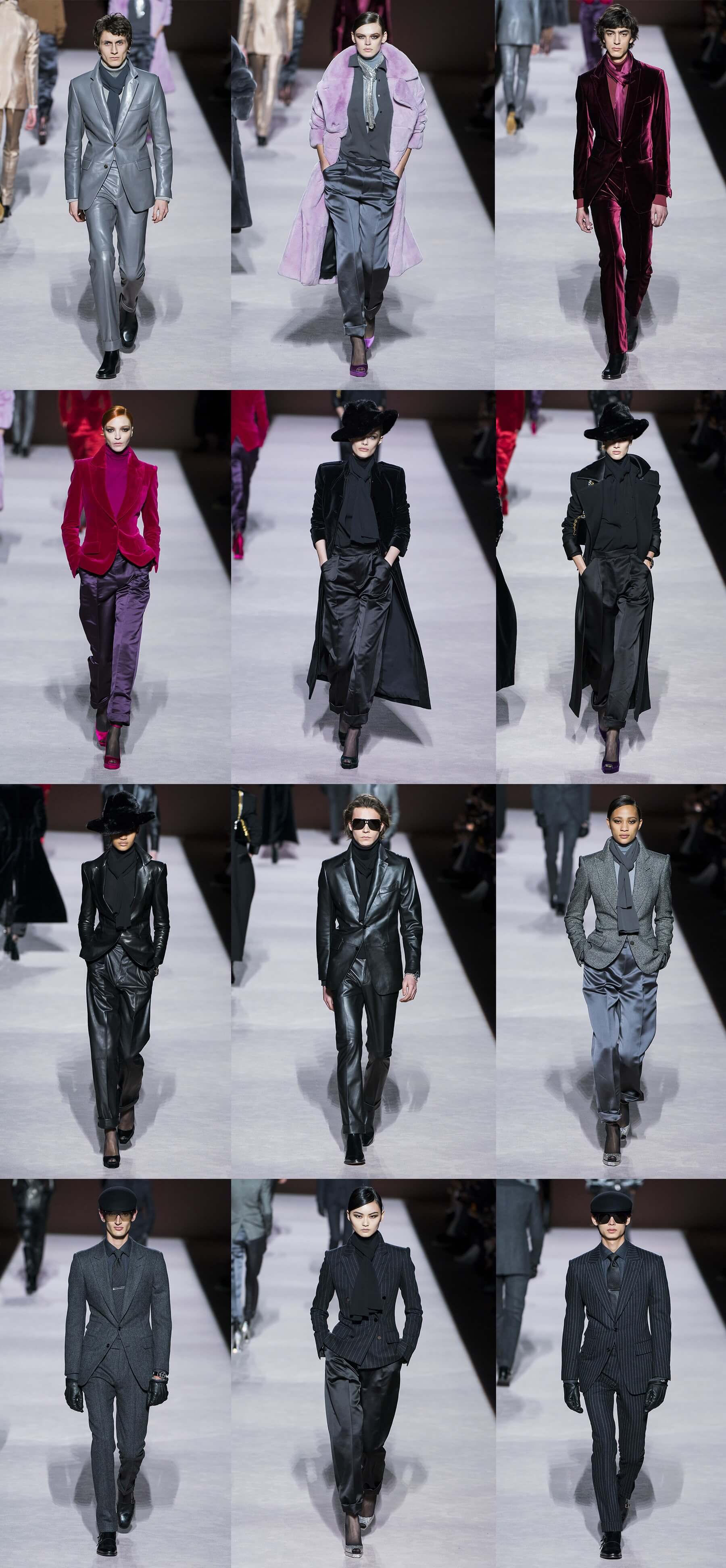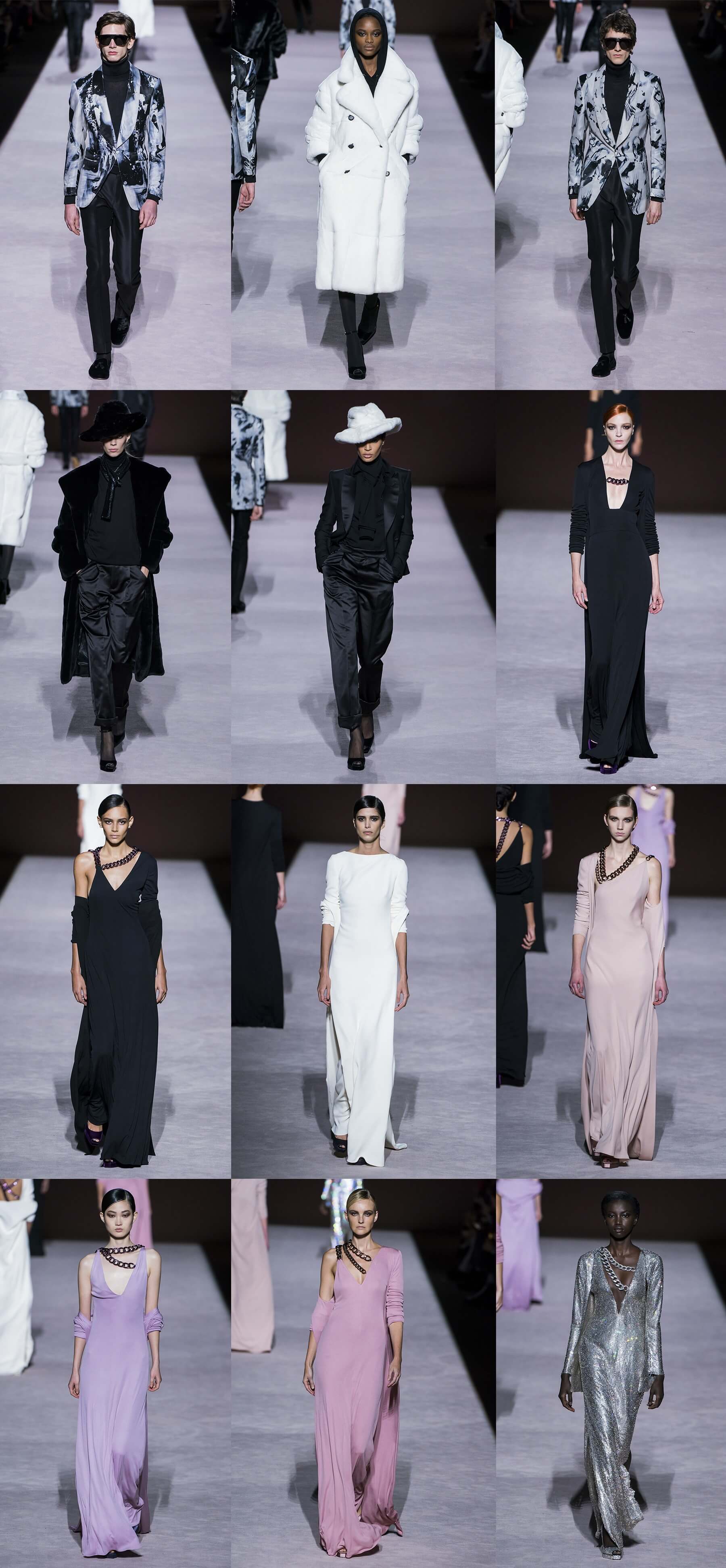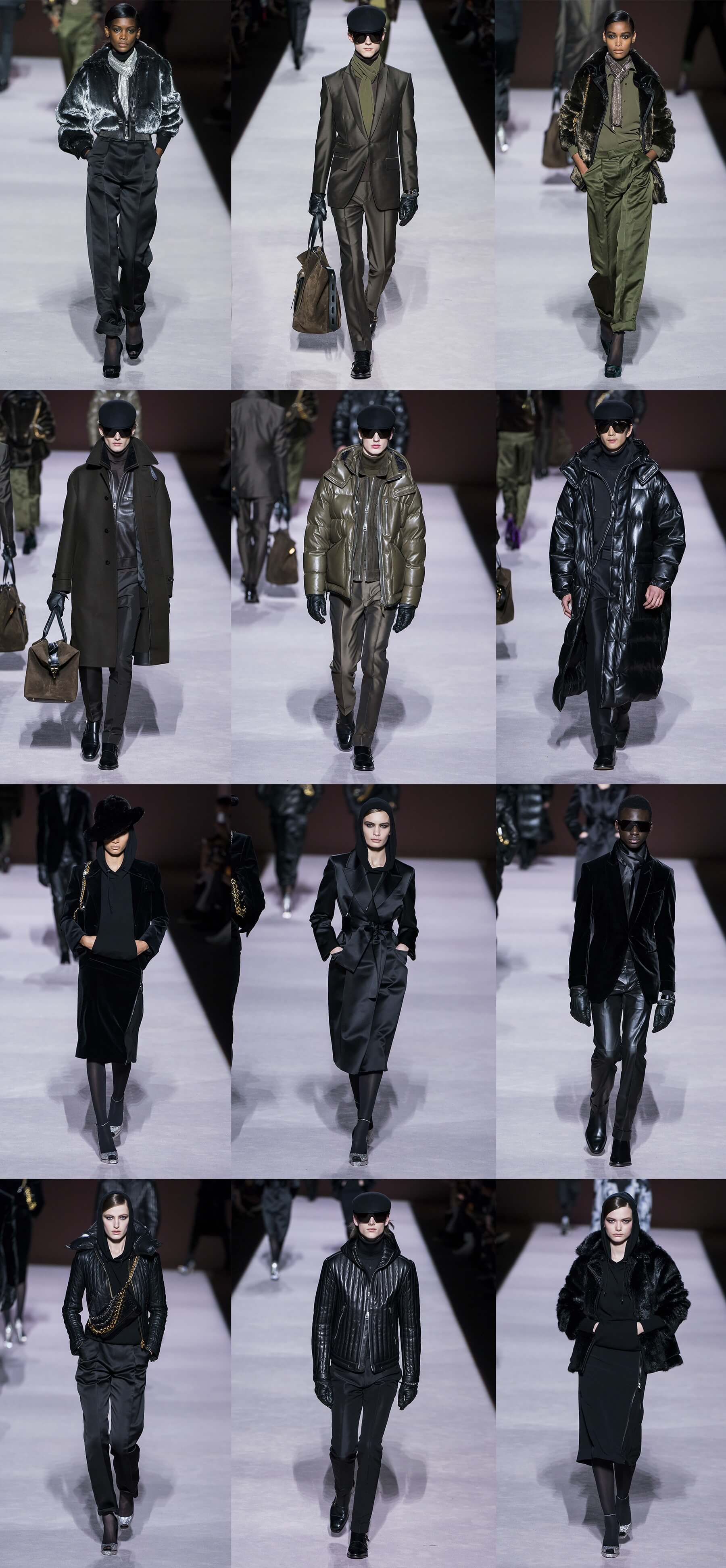 В отличие от предыдущей ready-to-wear-коллекции в духе "Вавилон — Берлин", представленная осенняя гораздо более сдержанна, в ней присутствуют спокойные и мягкие фактуры, комфортные силуэты шуб, пуховиков и широкие струящиеся брюки из сатина вместо узких юбок. Мужские костюмы традиционно демонстрируют высокое портновское искусство и выполнены в романтичных оттенках экрю и вишнёвого пурпурного с мягким отливом. Мягкие меховые шляпы-федоры будто призваны создать всеобъемлющее ощущение комфорта и защищенности. Однако Том Форд не забыл о гламуре, представив также по-голливудски роскошные серебряные платья, декорированные тяжелыми цепями в стиле Versace 90-х, и щегольской алый смокинг в собственном дизайнерском прочтении.