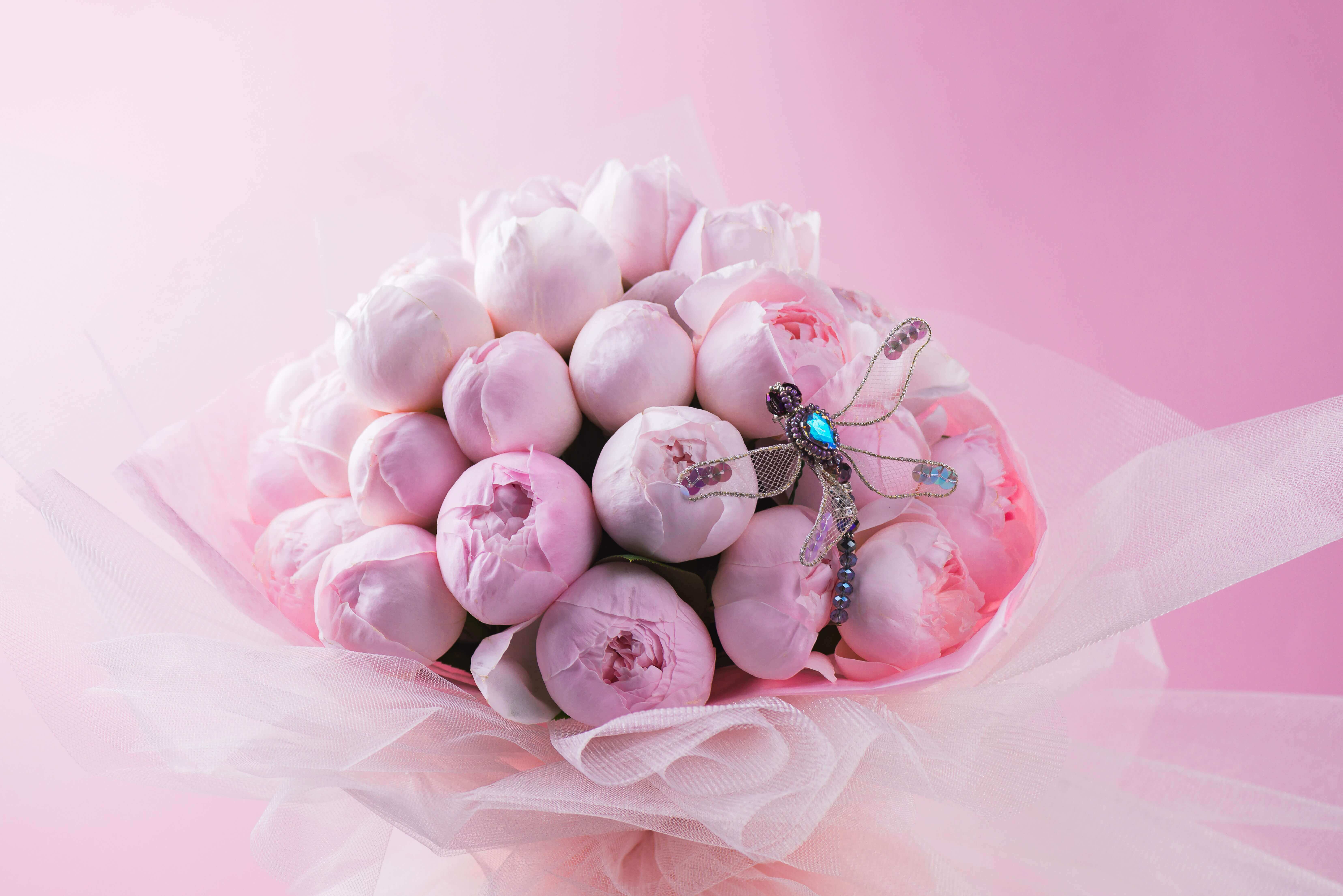Монохромные композиции всегда содержат две очень важные вещи: форму и текстуру. Если нужно выделить форму цветка – шарообразную, как в этом букете, и текстуру нежной упаковки из фатина, смело используйте монохром. Такие композиции всегда выигрышно подчеркнут не только цветок, но и настроение с помощью всего лишь одного выбранного вида цвета. А пастельный розовый всегда означает нежность, свежесть и трепетную любовь.