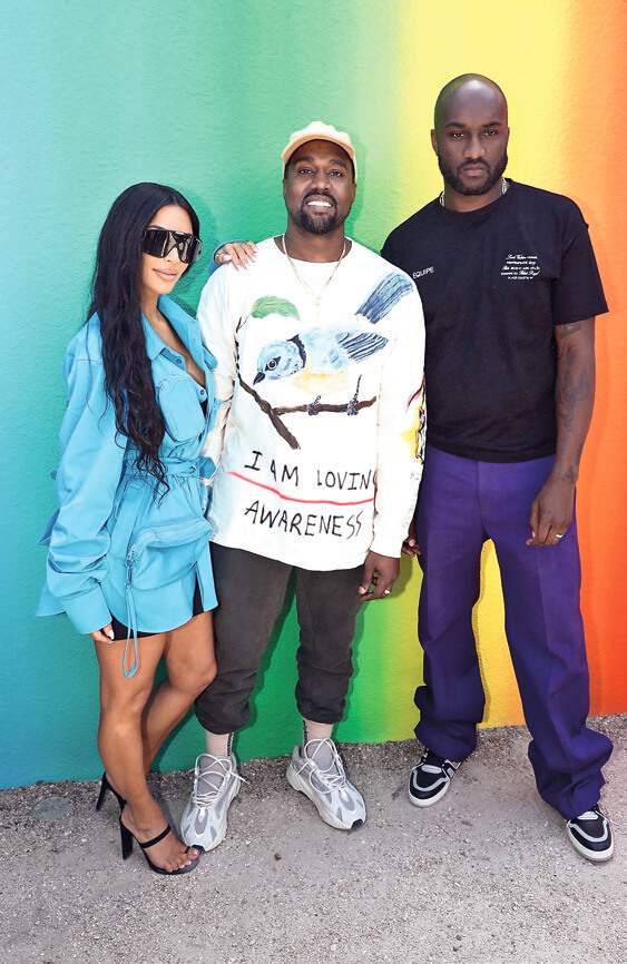 Вирджил Абло с Ким Кардашьян и Канье Уэстом на показе его первой мужской коллекции для Louis Vuitton в Париже в июне 2018 года