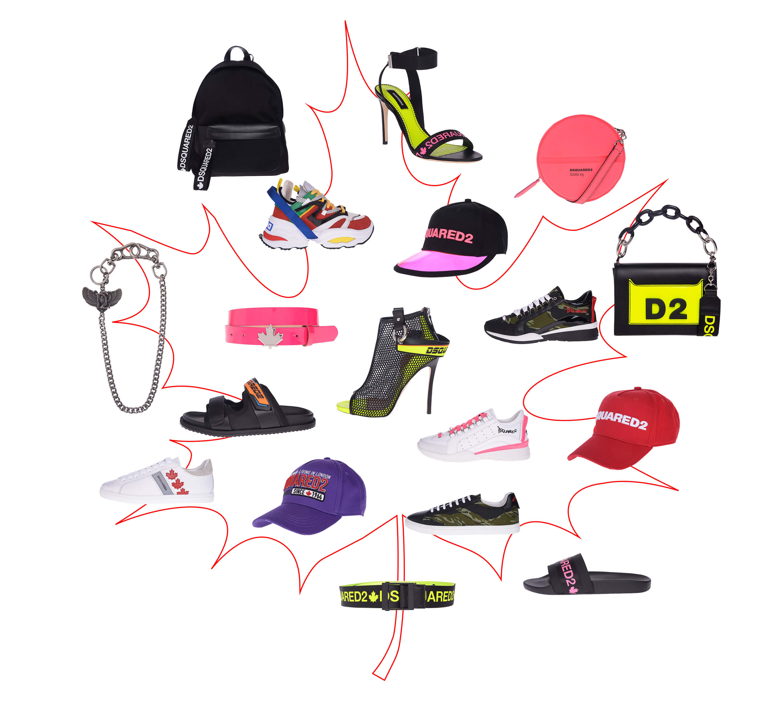 Неоновые огни большого города в сезоне весна-лето от DSQUARED2. Здесь и главная обувь сезона — ugly shoes, кроссовки с колорблоками и сложносочиненные босоножки, и спортивные кепки-блейзеры, и ремни маркерных цветов. Среди ярких атрибутов уличной моды также есть практичные базовые рюкзаки с логотипами бренда, поясные сумки-таблетки с дозировкой 200 mg DSQUARED2, которые станут идеальным провокационным акцентом в весенних образах, и массивные цепи — их можно носить на джинсах, юбках и классических брюках.