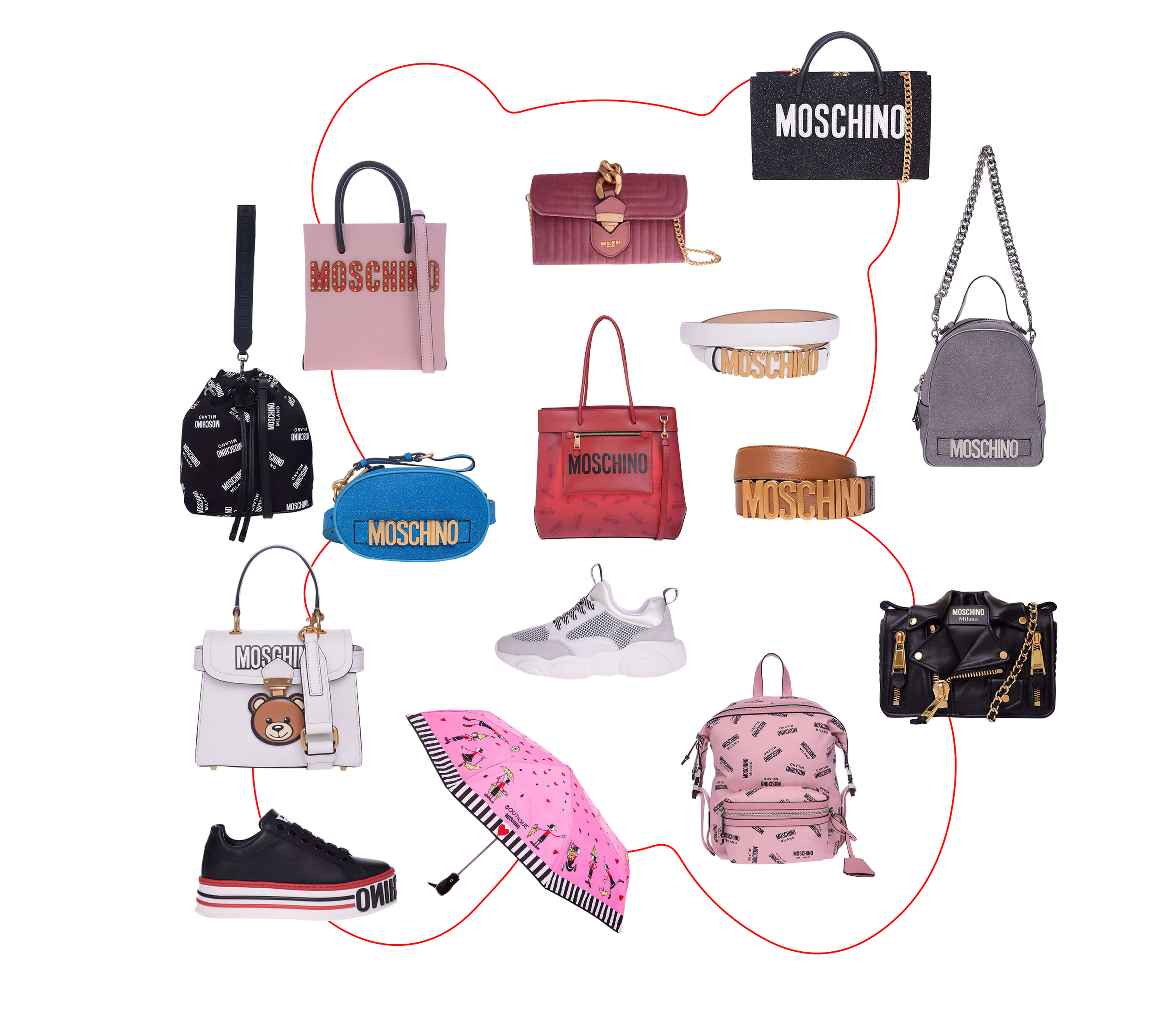 Любимец Джереми Скотта, улыбчивый мишка, стал настоящим талисманом бренда. Он появляется то на сумках, платках, юбках и свитшотах, а то и вовсе в качестве силуэтной подошвы на кедах. Весной забавный персонаж станет уместным дополнением к лёгким образам, а в комплекте с тяжелыми ботинками, лаковым плащом или косухой составит эффектный и ироничный образ. В пик весенних дождей верным спутником вашему образу станет зонт конфетно-розового оттенка, удобная поясная сумка, а вместительная сумка-тоут с логотипом бренда пригодится для активных будней. Продолжая тему логомании, которая все еще удерживает позиции в качестве одной из главных тенденций, можно позволить себе не только сумку, рюкзак или ремень с надписью Moschino, но и кеды на высокой подошве с фирменными буквами.