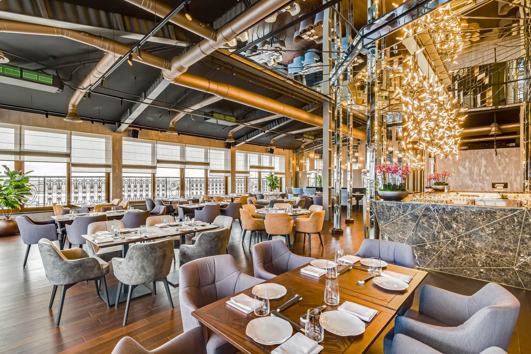 Особенная черта КАМА – панорамный вид на старинный Подол и акваторию Речного порта, красивый и оживленный как в дневное, так и в вечернее время. Ресторан состоит из большого и шумного основного зала, лаундж-зоны со спокойной атмосферой, контактного бара, открытой кухни, vip-room и курительной комнаты.