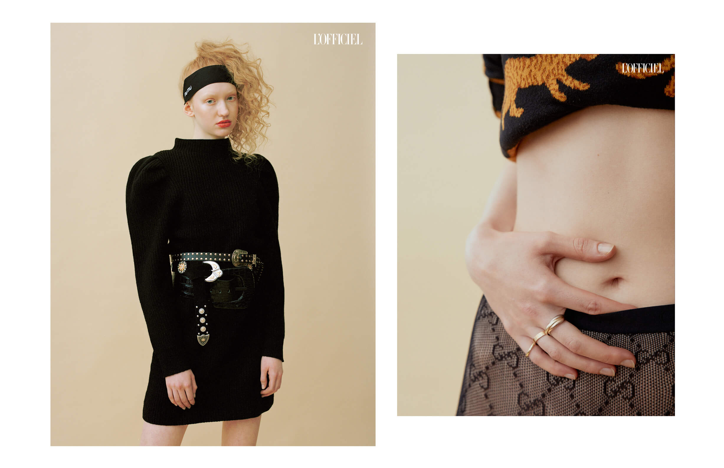 Слева: платье Sandro, пояс Maje, пояса Vintage, повязка Miu Miu. Справа: топ Vintage, колготки Gucci, кольца Cartier, кольцо Golpira